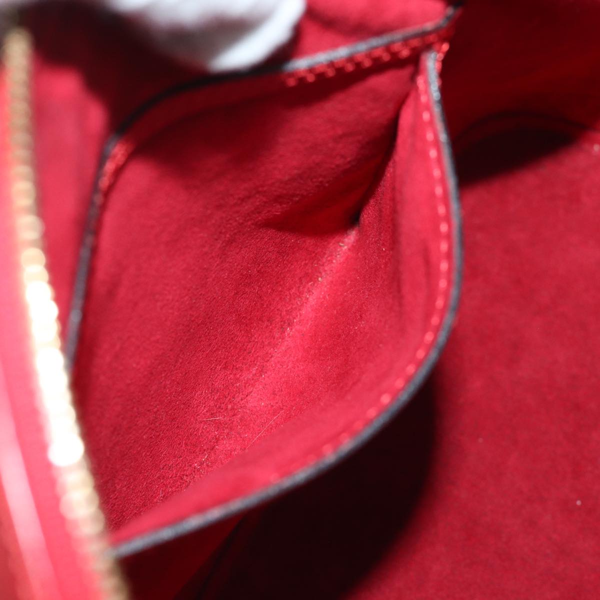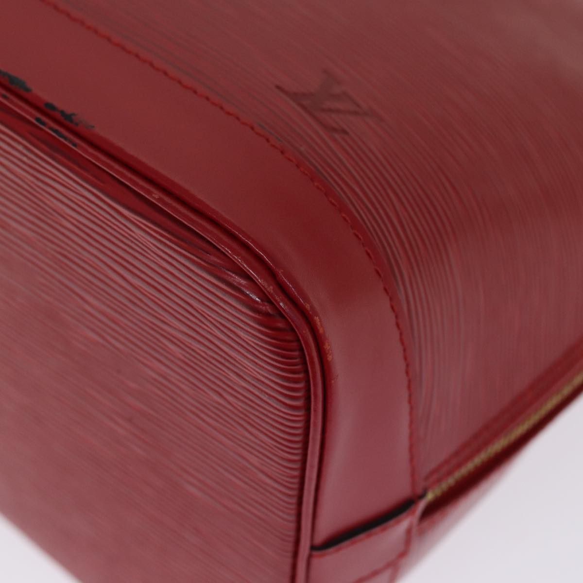 The exterior shows some rubbing, with slight surface deformation and rubbing at the corners. The handle also shows some rubbing, while the fittings show light scuffing and discoloration. The interior shows light rub marks and a stain, and the pocket shows light rubbing. There is also a storage odor.