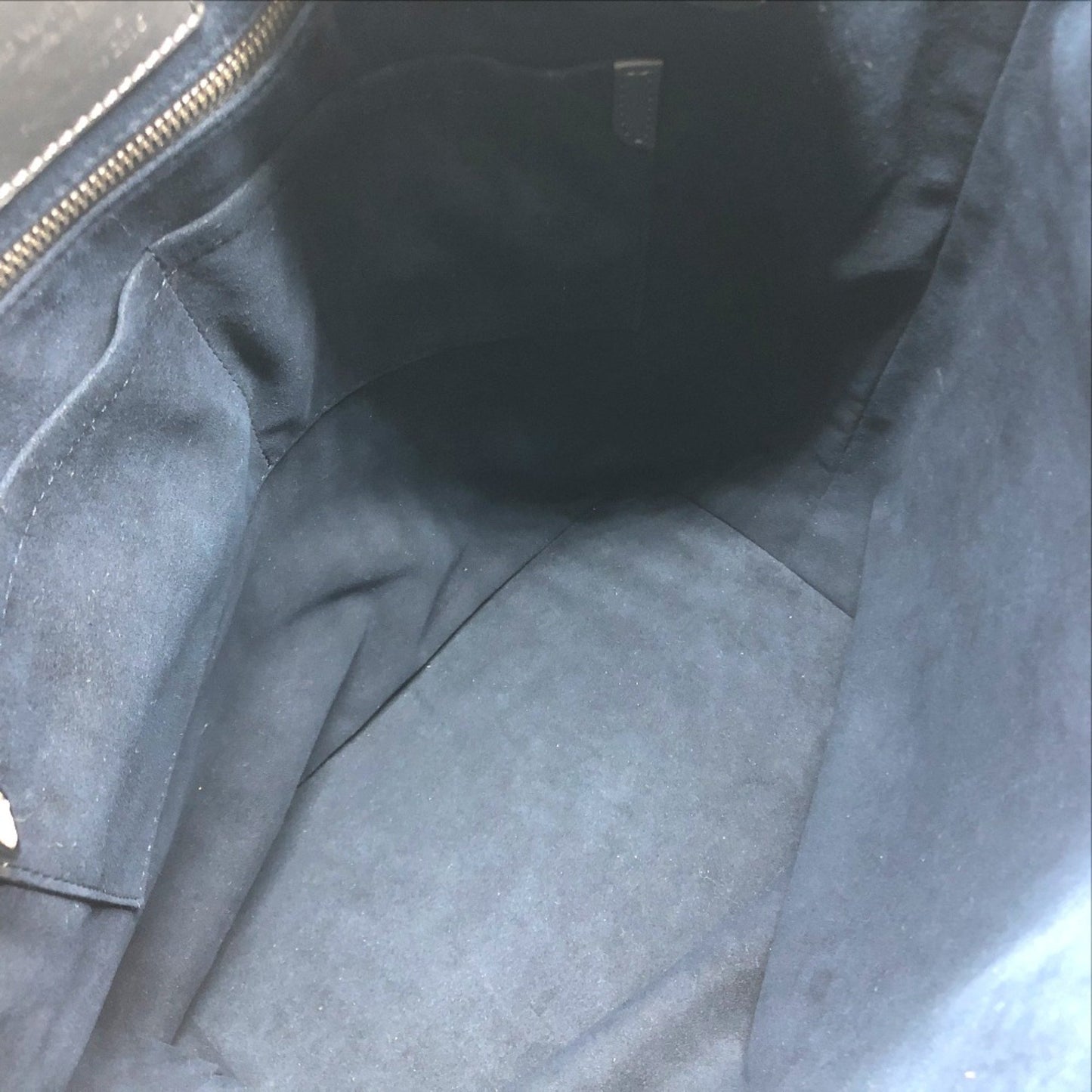 The exterior of the bag shows slight shape distortion, scuffing, slightly worn corners and lightly rubbed handles. Inside, there are a few small stains.