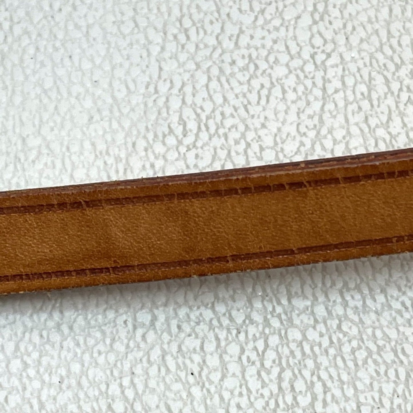 It shows scratches, visible dirt, and a minor crack and scratch on the strap. Despite these signs of wear, it remains a charming and practical accessory.
