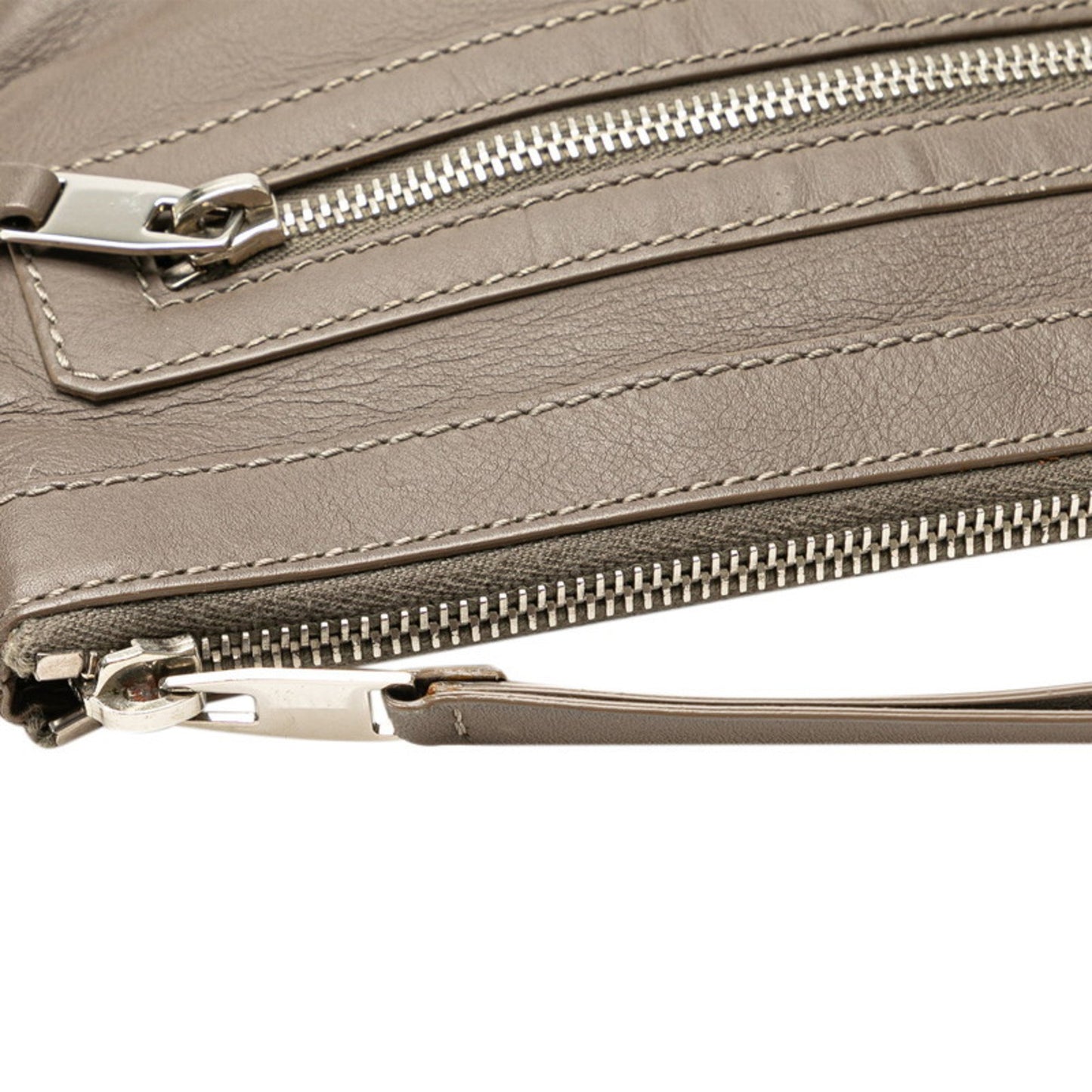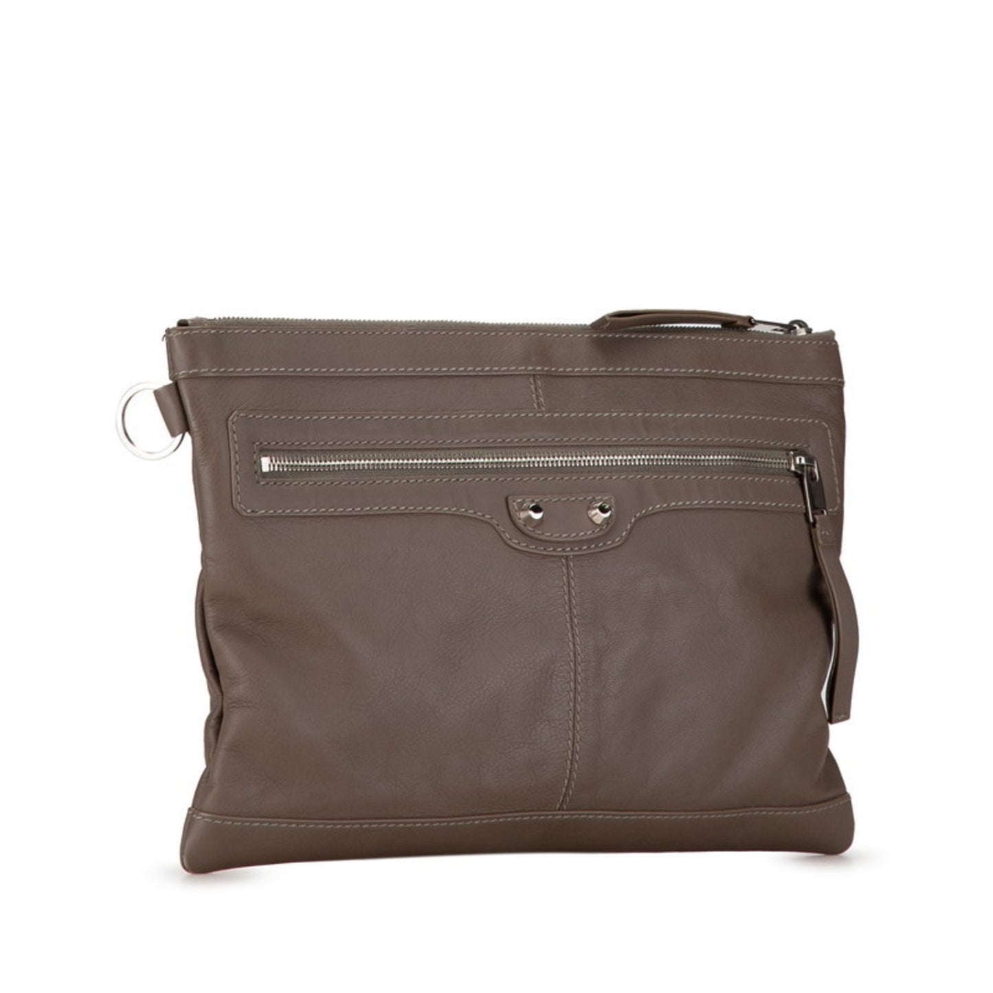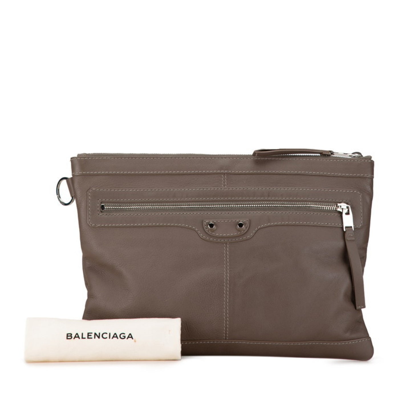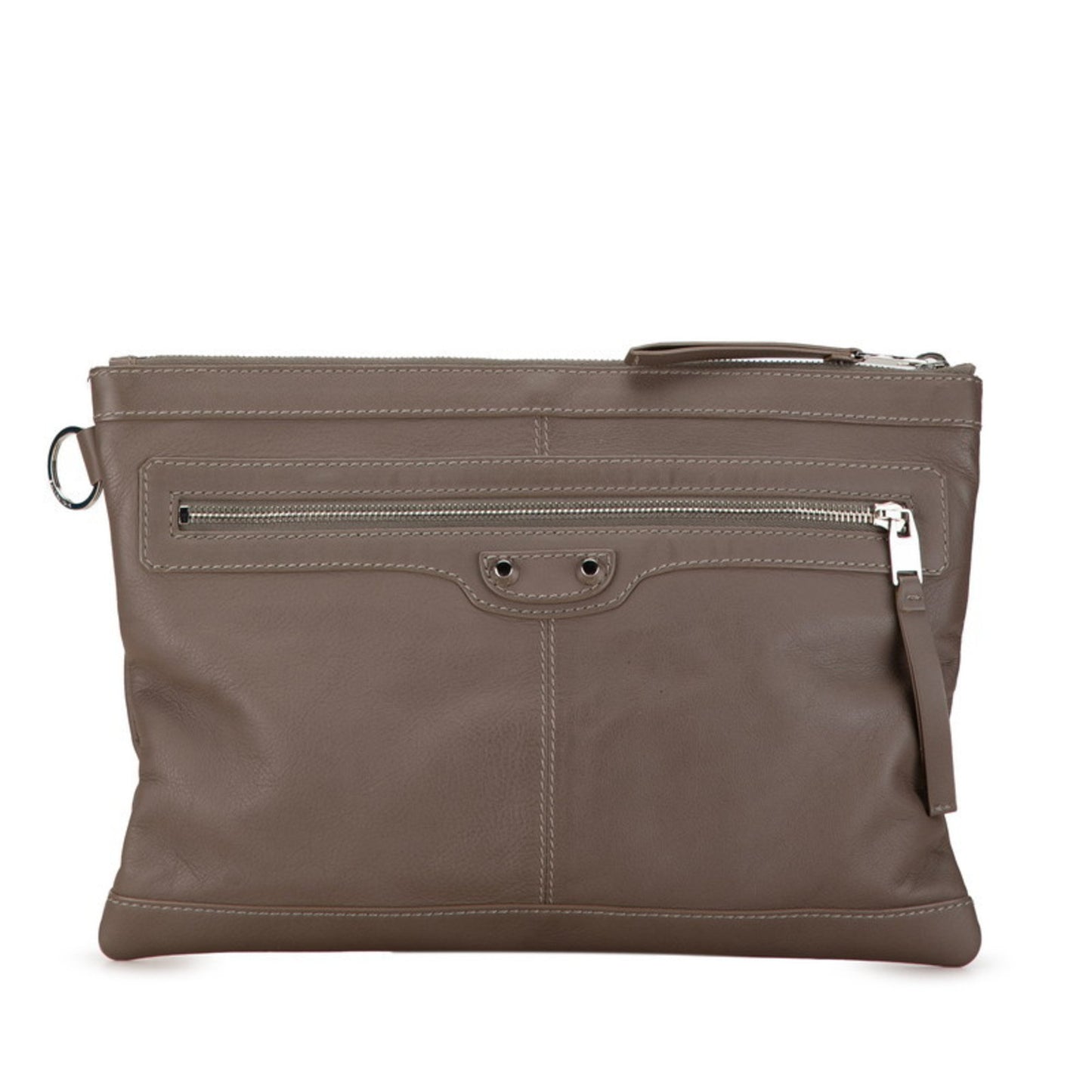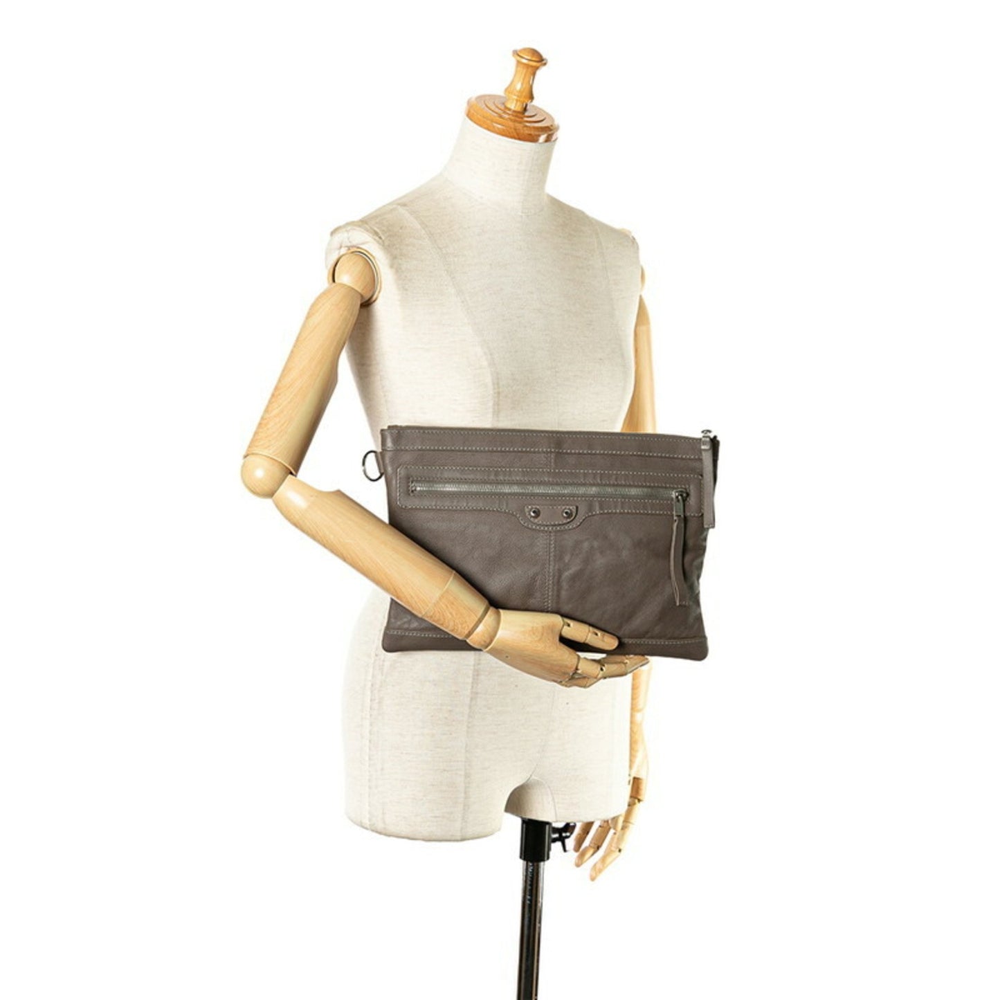 This Balenciaga Classic Pouch clutch bag, designed for women, is crafted from gray leather. It offers a sleek and sophisticated look, ideal for various occasions.