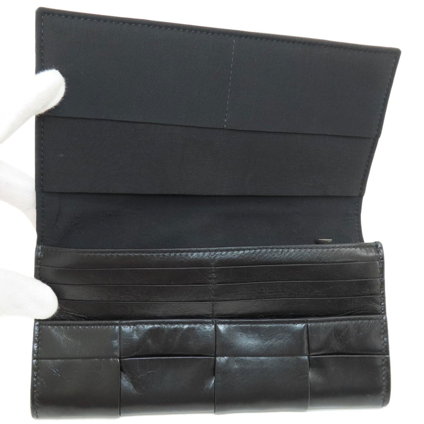The Bottega Veneta "Cassette" long wallet is designed specifically for women, featuring a bi-fold design made from luxurious black leather. This wallet blends functionality with sophistication, making it a versatile accessory for daily use.