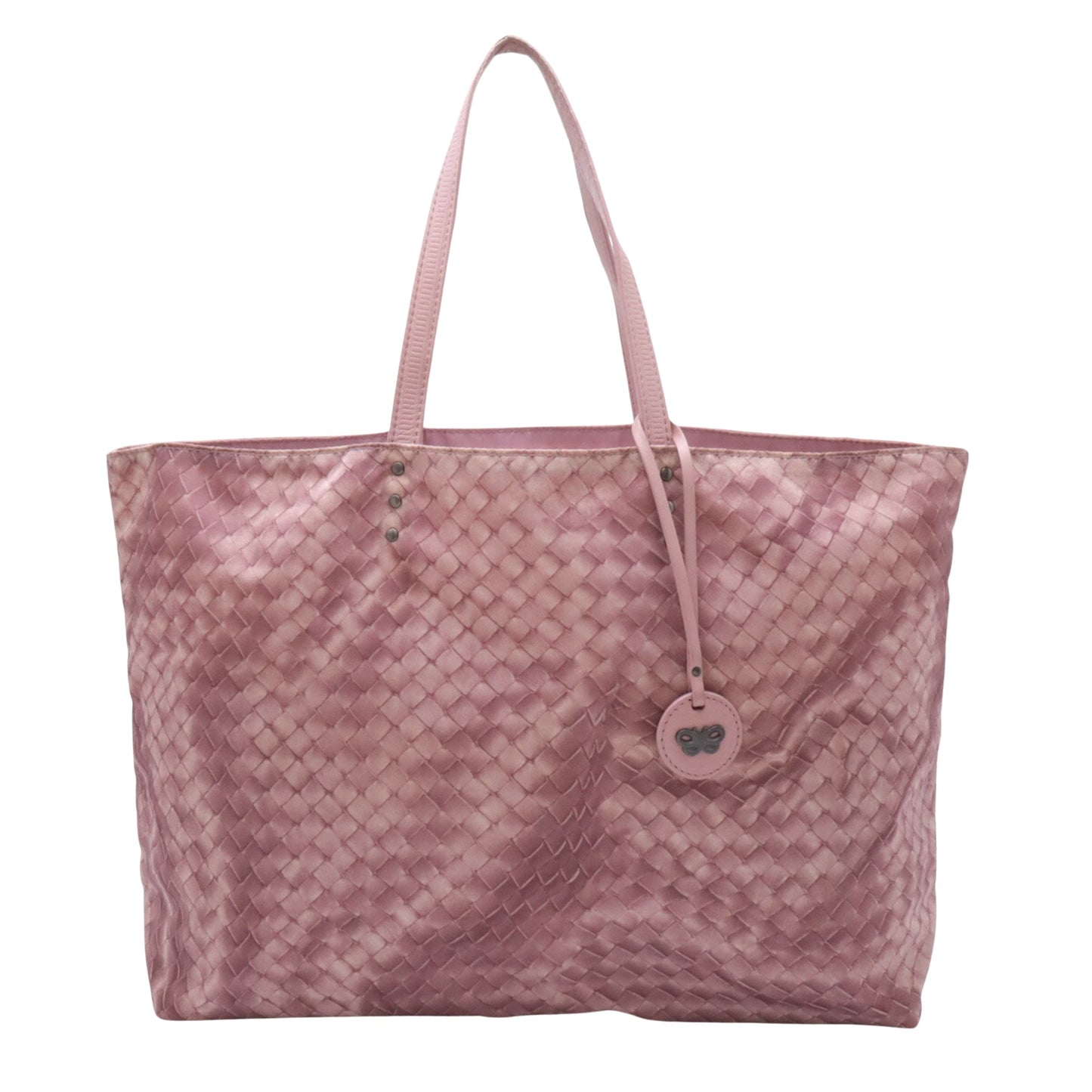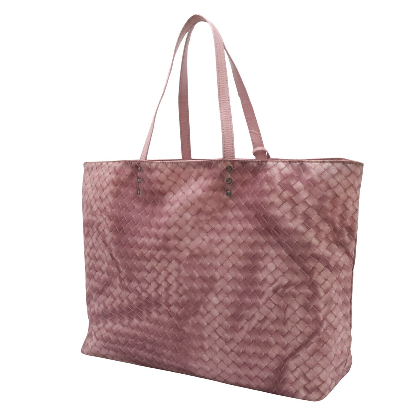 The Bottega Veneta Intrecciolusion shoulder bag, which can also be used as a tote, is a stylish accessory for women, crafted from durable nylon in a delicate dusty pink color. Its elegant design and functional size make it a versatile addition to any wardrobe.
