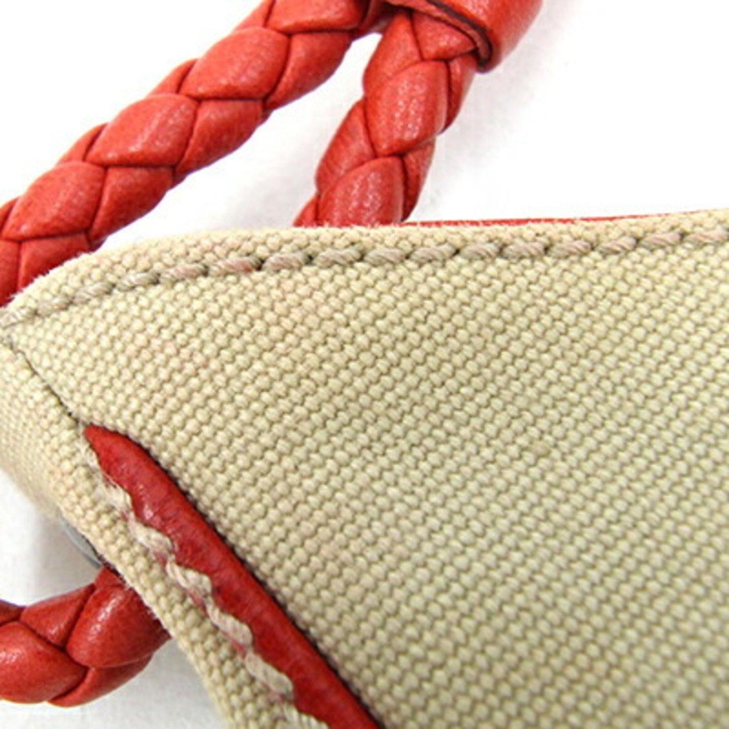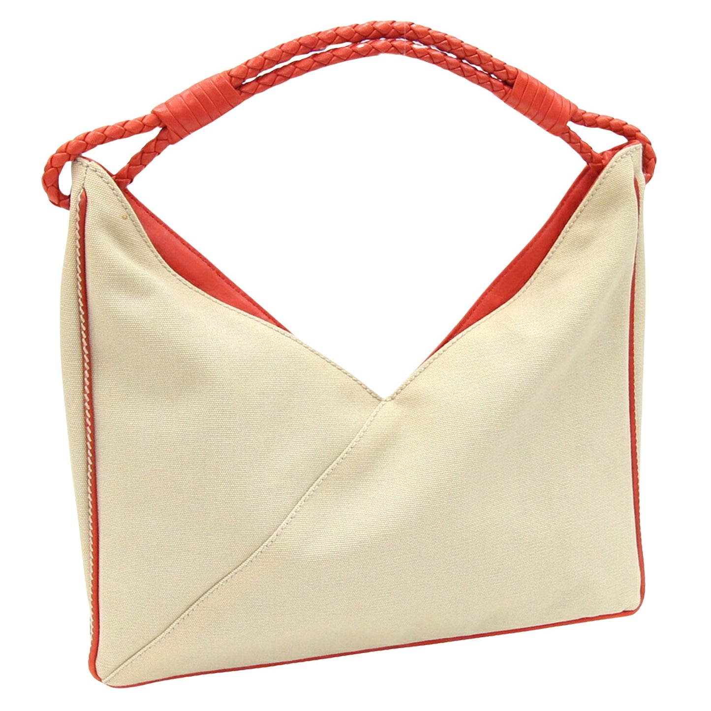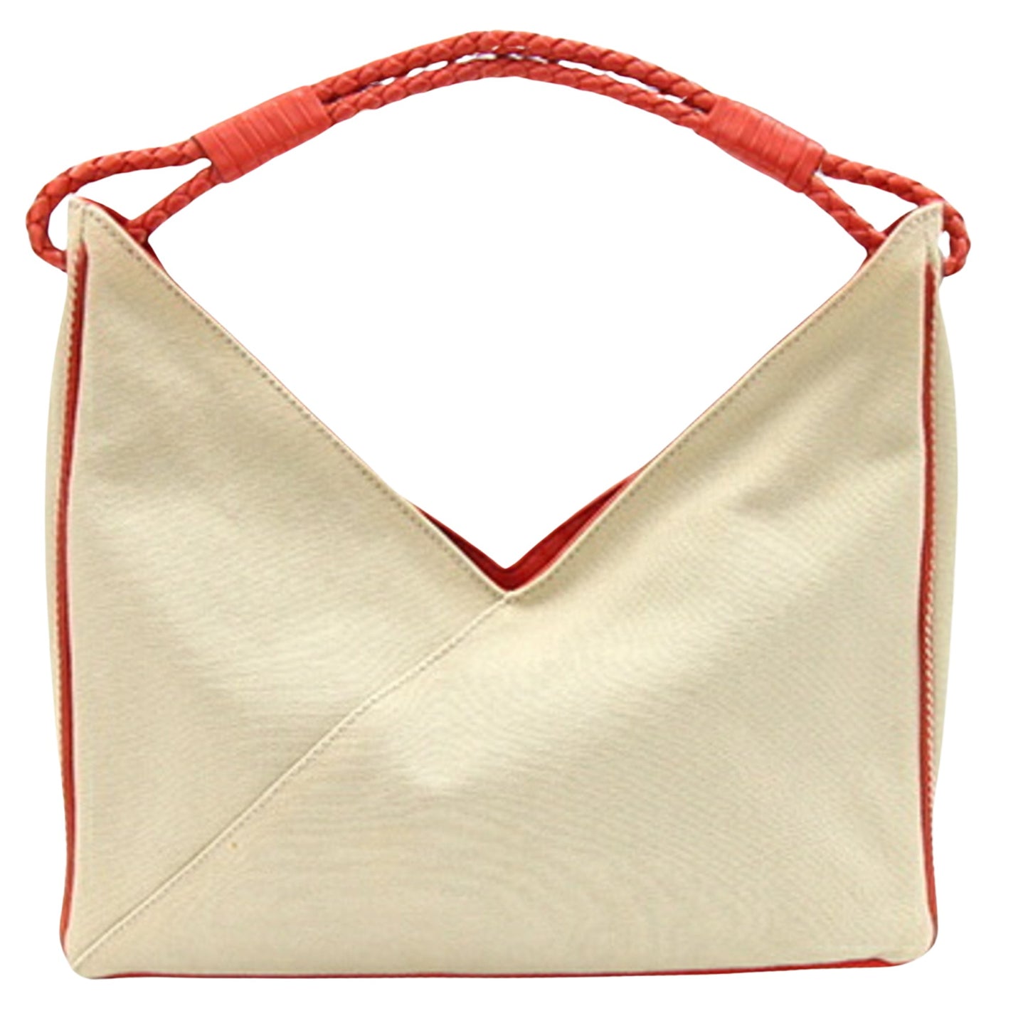 The Bottega Veneta handbag is a stylish accessory crafted from beige and orange canvas leather. Its design combines practicality with elegance, making it a versatile choice for various occasions.