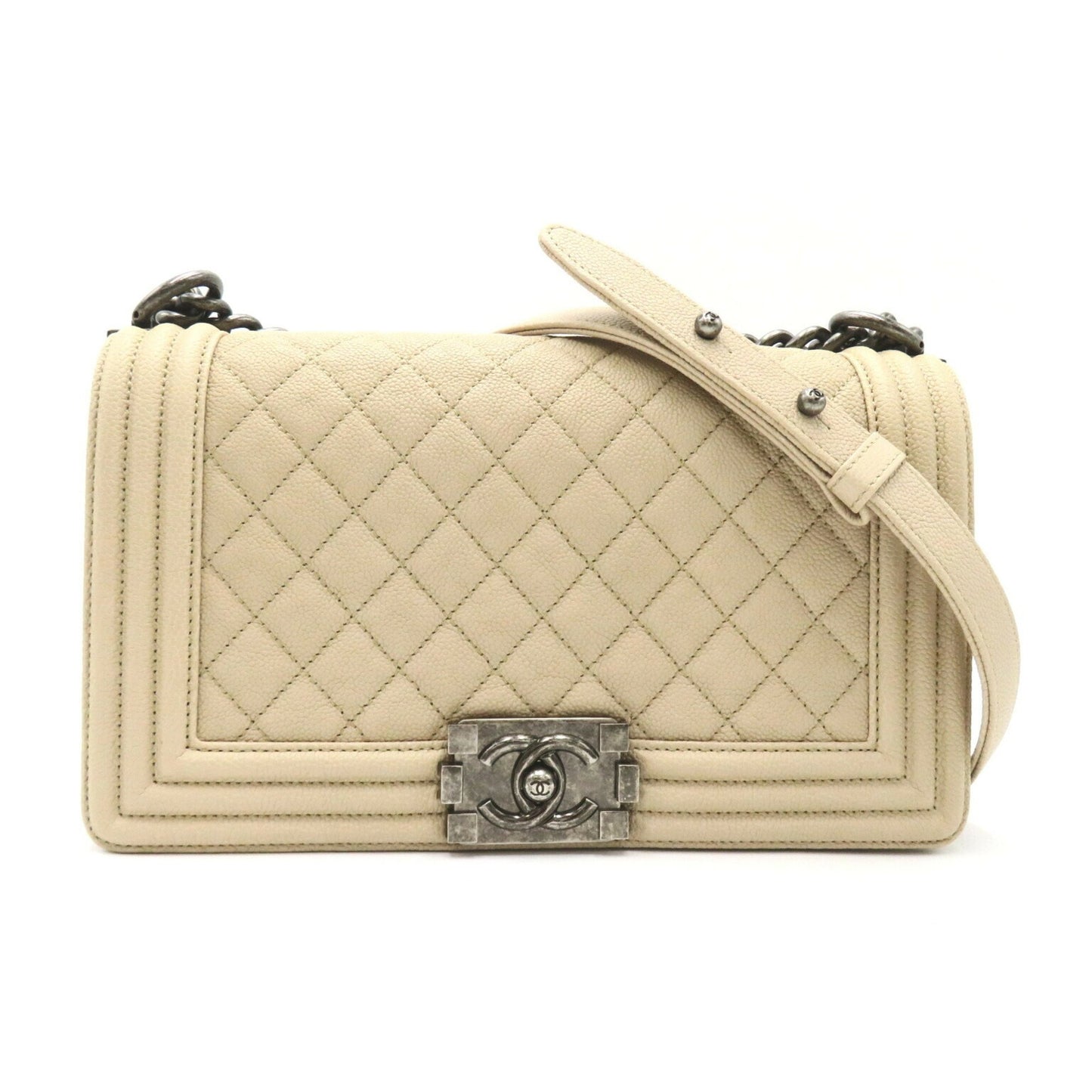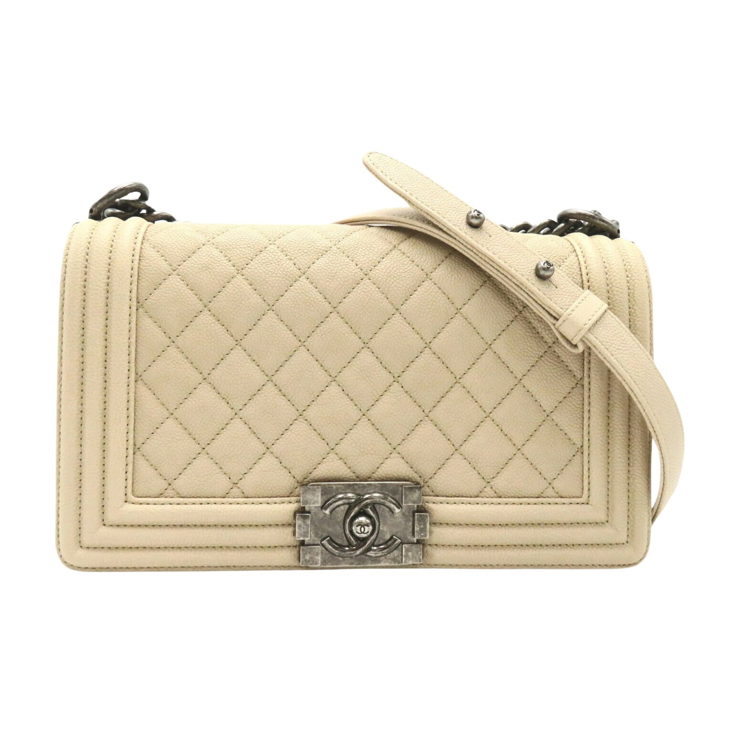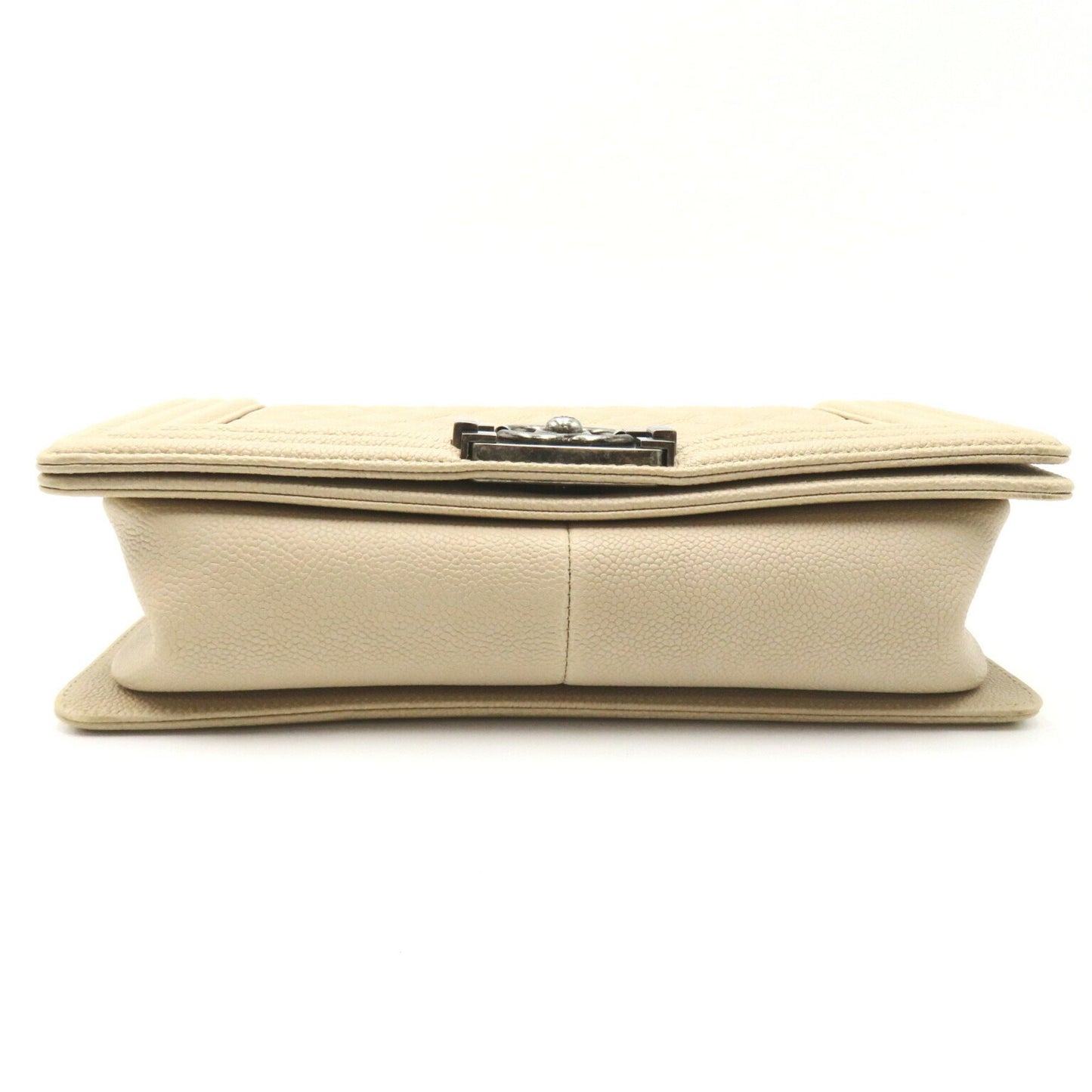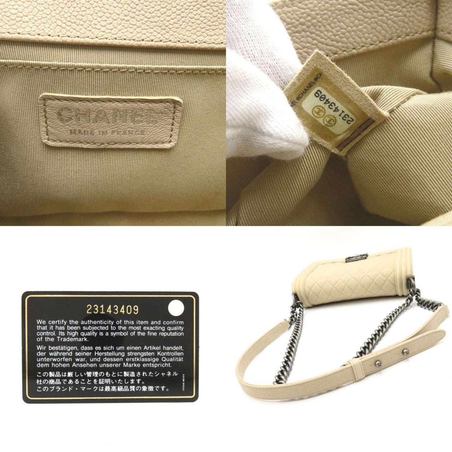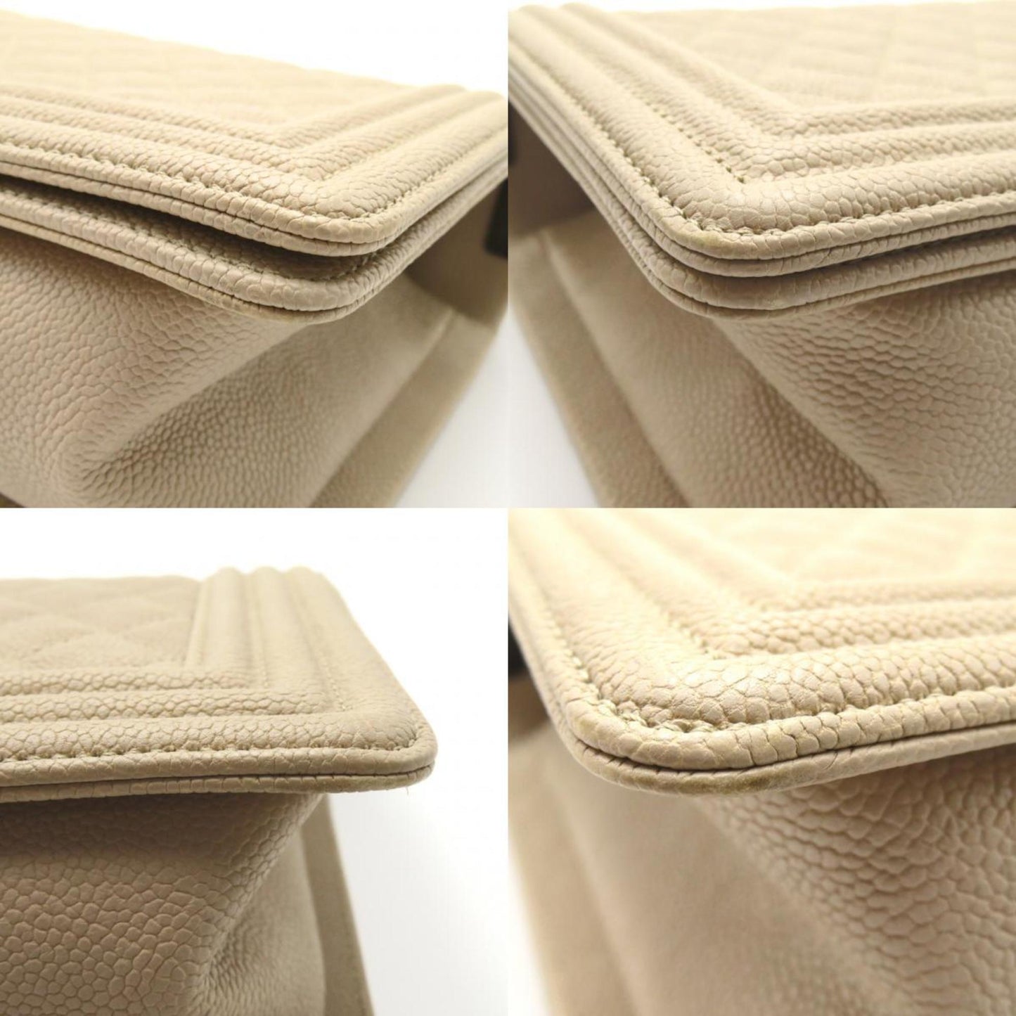 This Chanel Boy shoulder bag, designed for women, is made from beige caviar leather, offering a luxurious and durable texture.