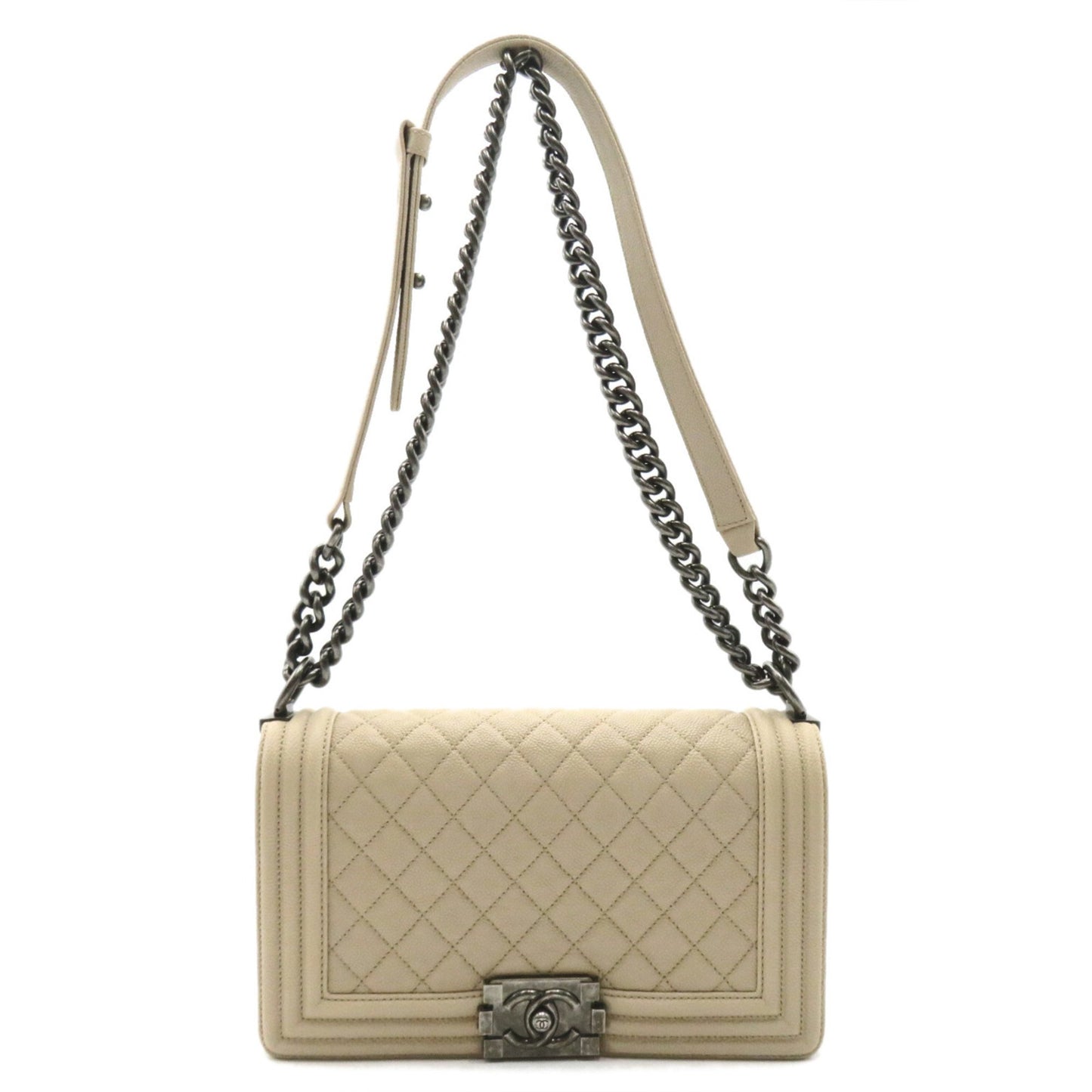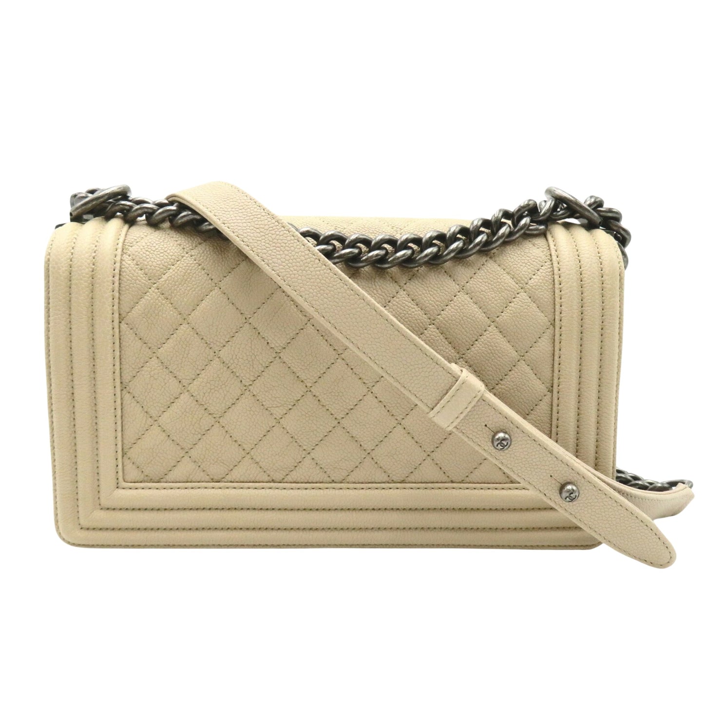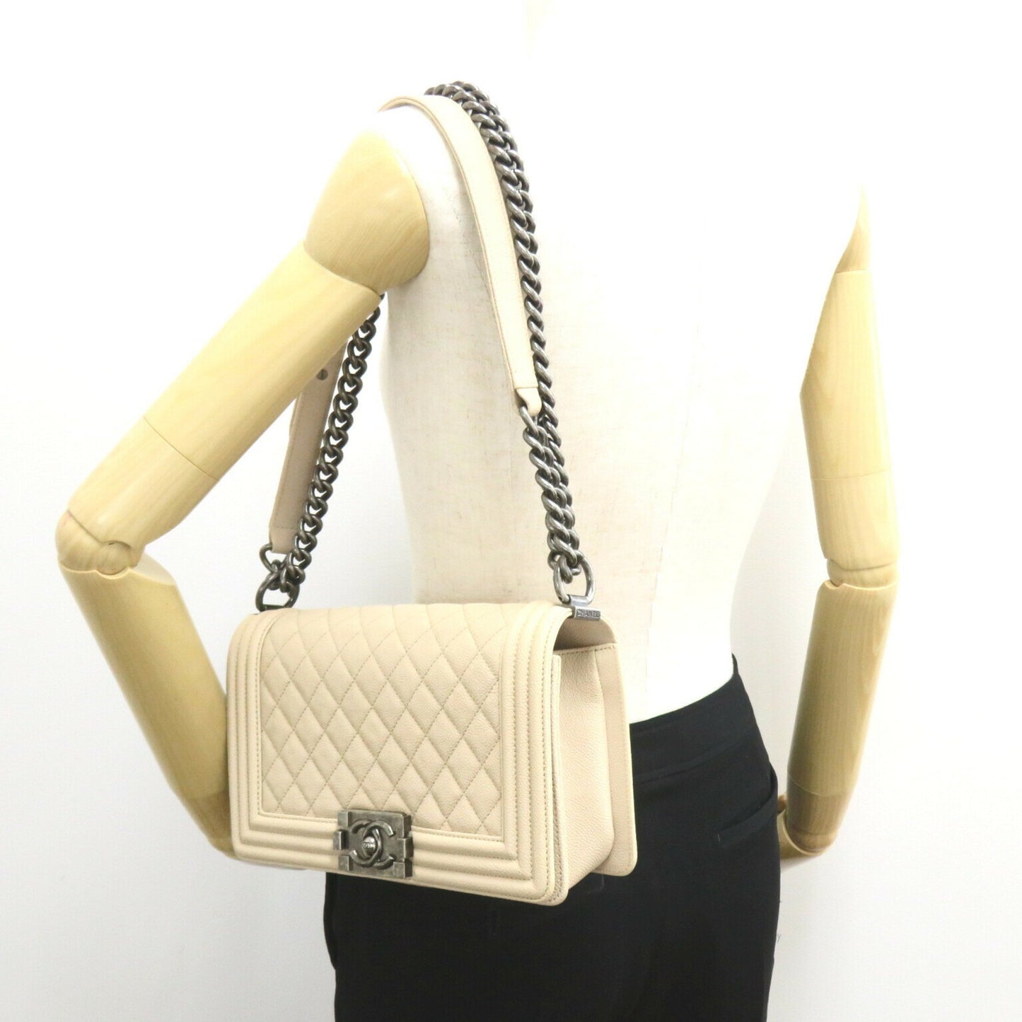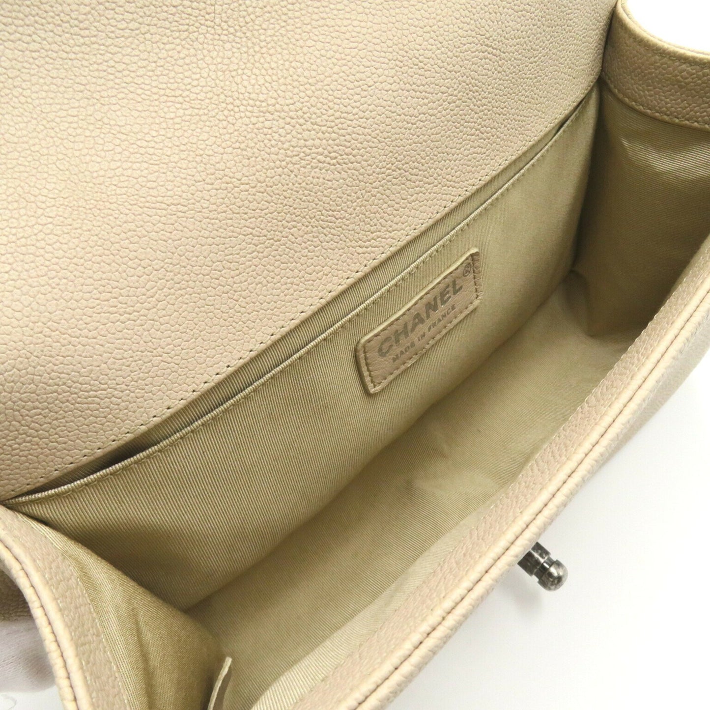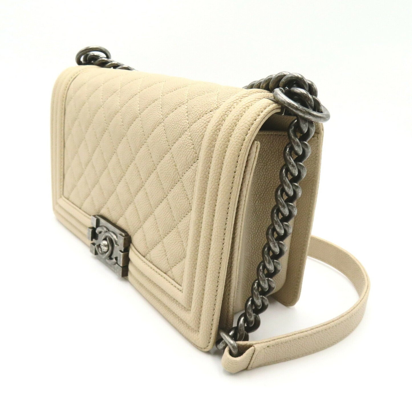 This Chanel Boy shoulder bag, designed for women, is made from beige caviar leather, offering a luxurious and durable texture.