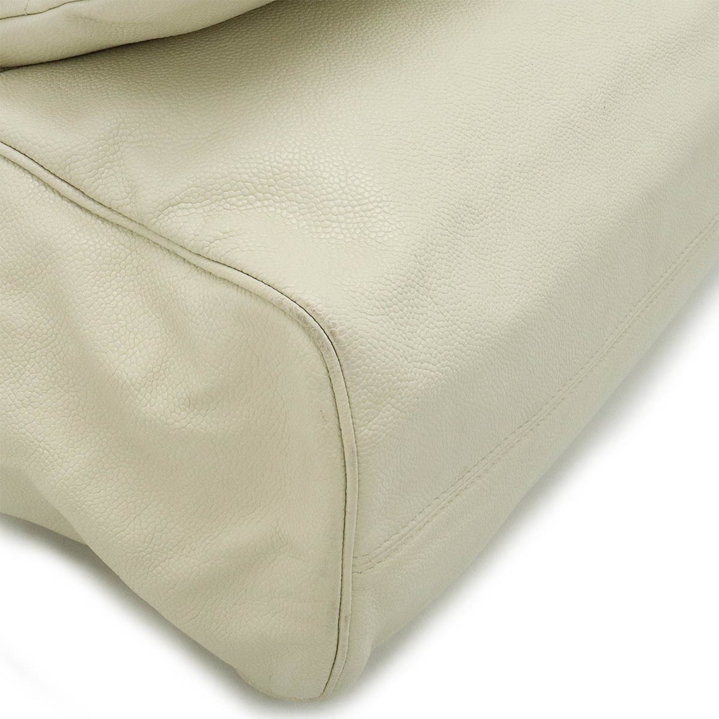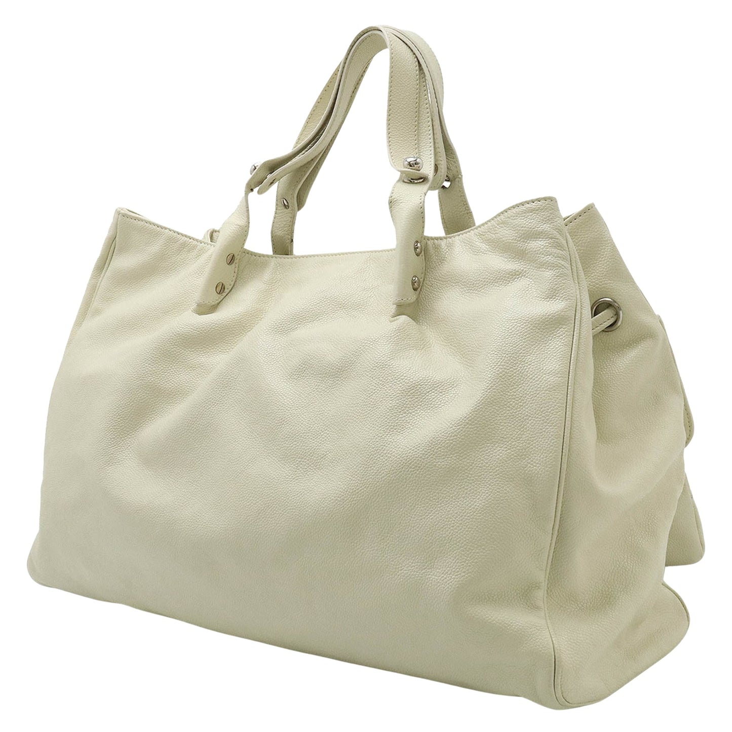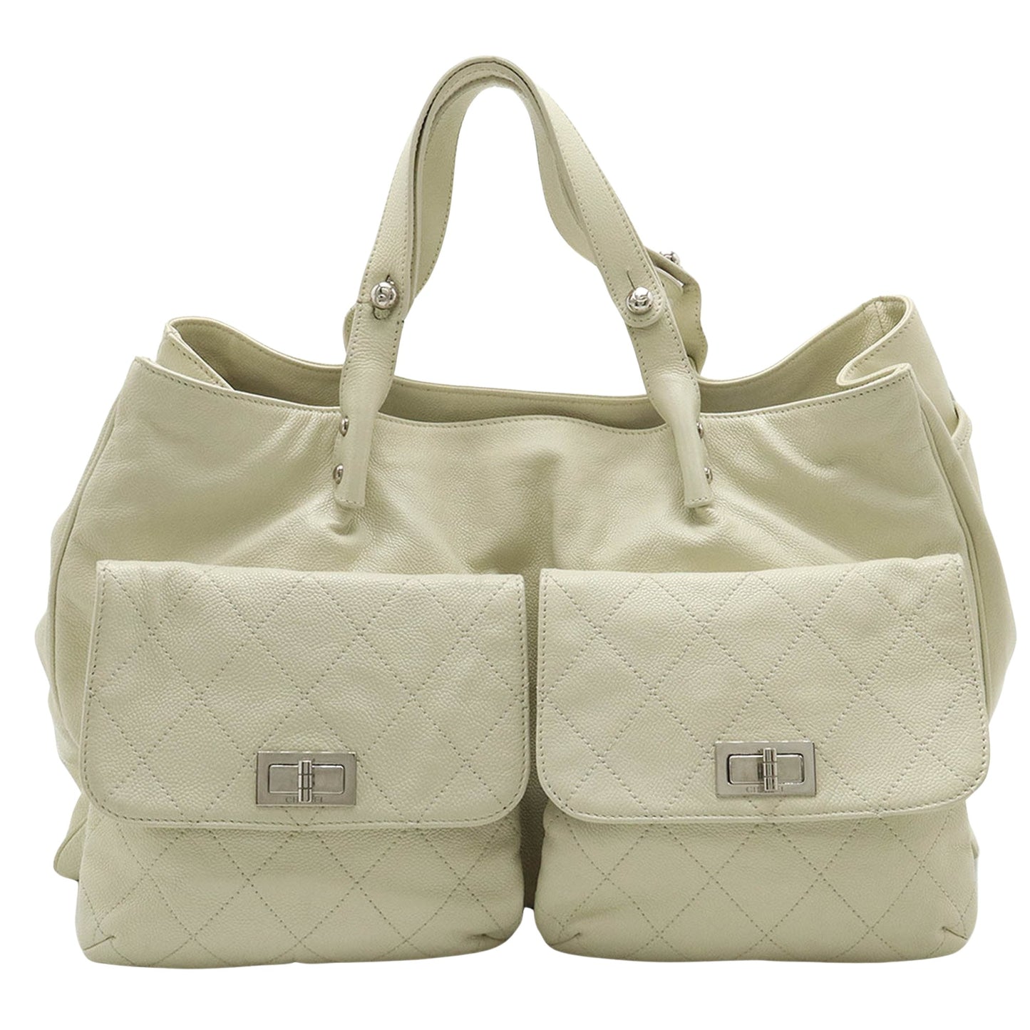 This Chanel Cabas handbag from the iconic 2.55 line, crafted in luxurious ivory and white caviar leather, offers a sophisticated blend of style and practicality. It features a secure turn-lock closure and an additional turn-lock outer pocket.