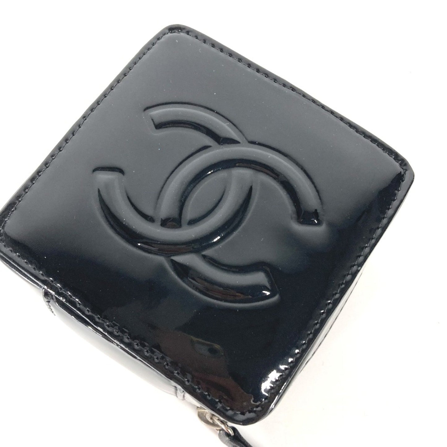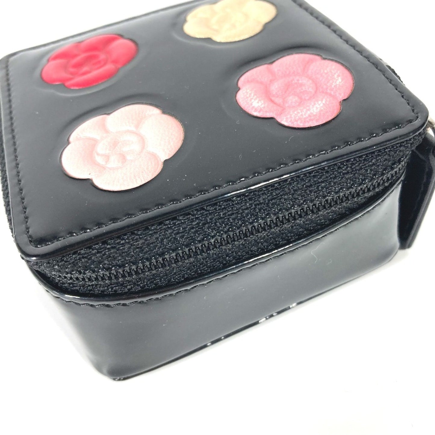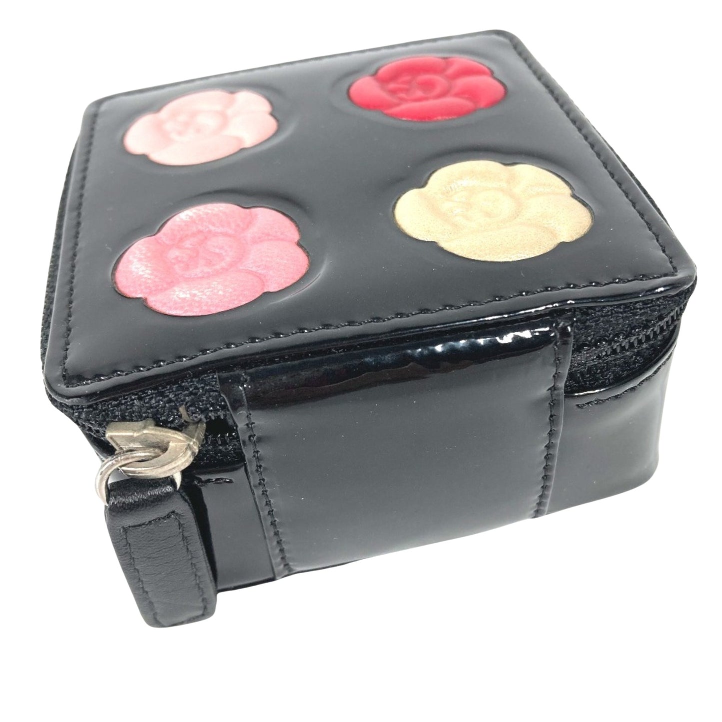 This chic pouch from Chanel's Camelia collection is crafted from patent leather in a sleek black color, showcasing a sophisticated design.