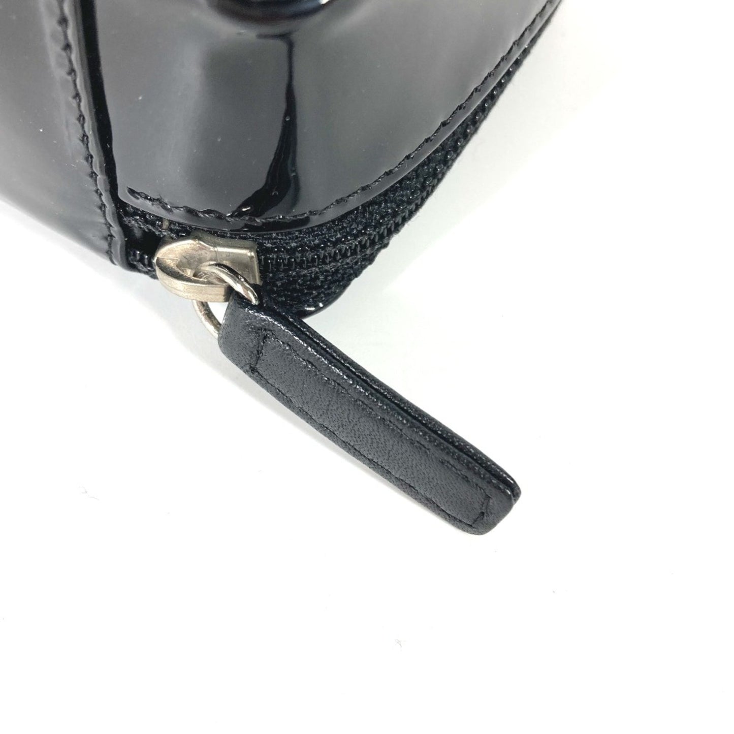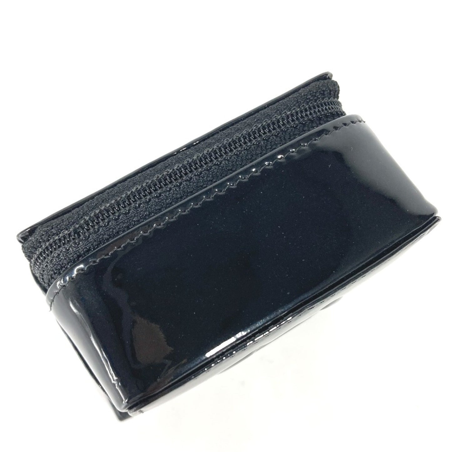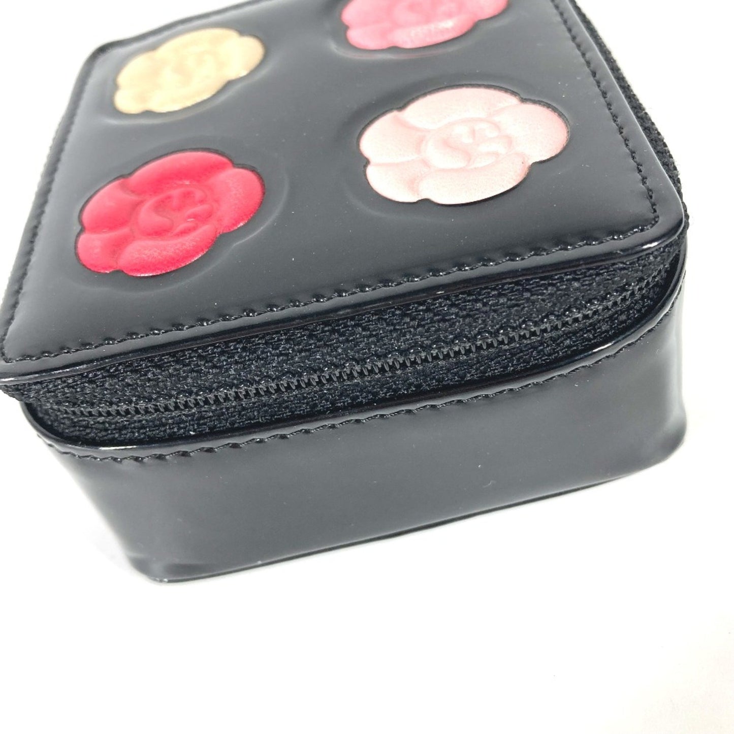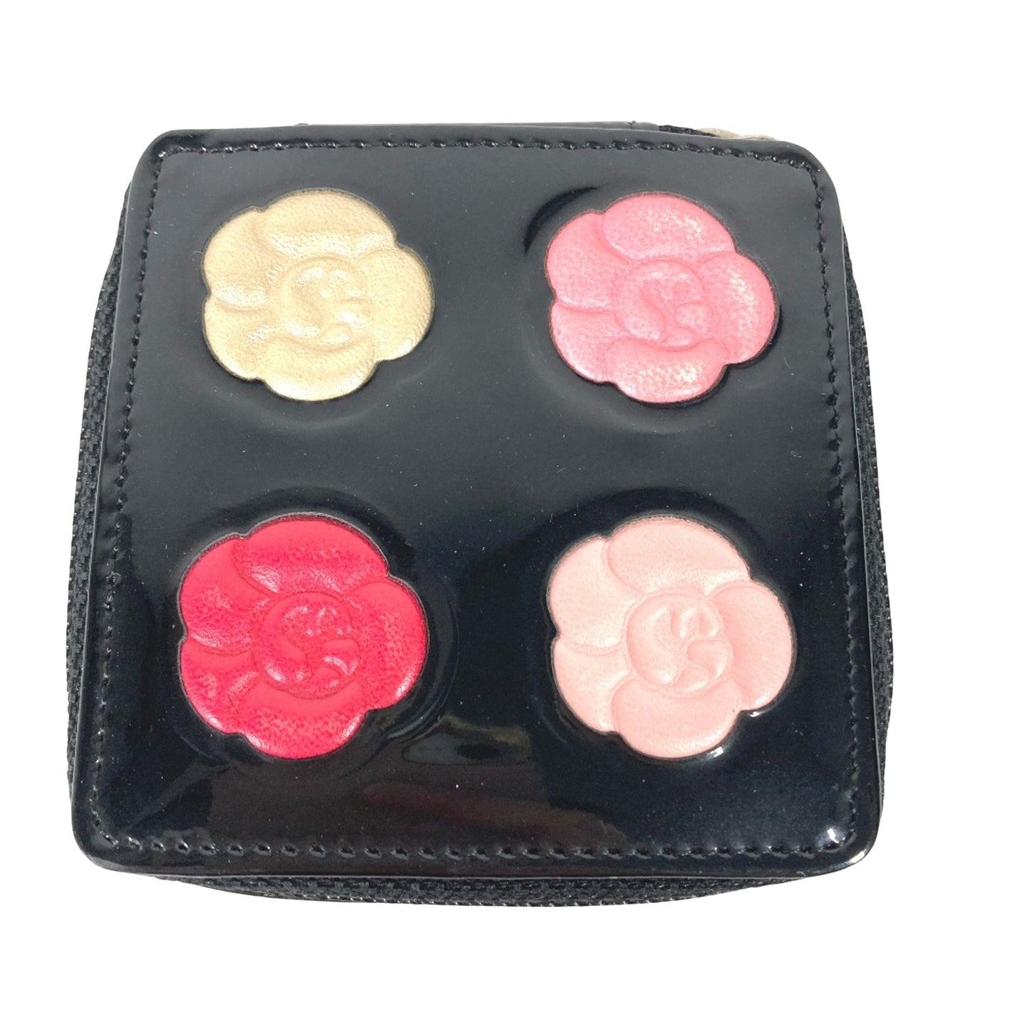 This chic pouch from Chanel's Camelia collection is crafted from patent leather in a sleek black color, showcasing a sophisticated design.