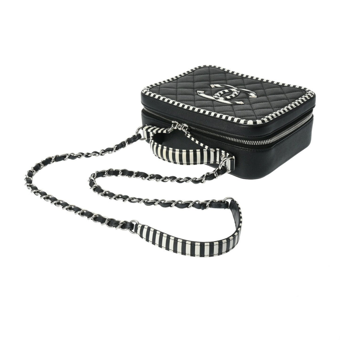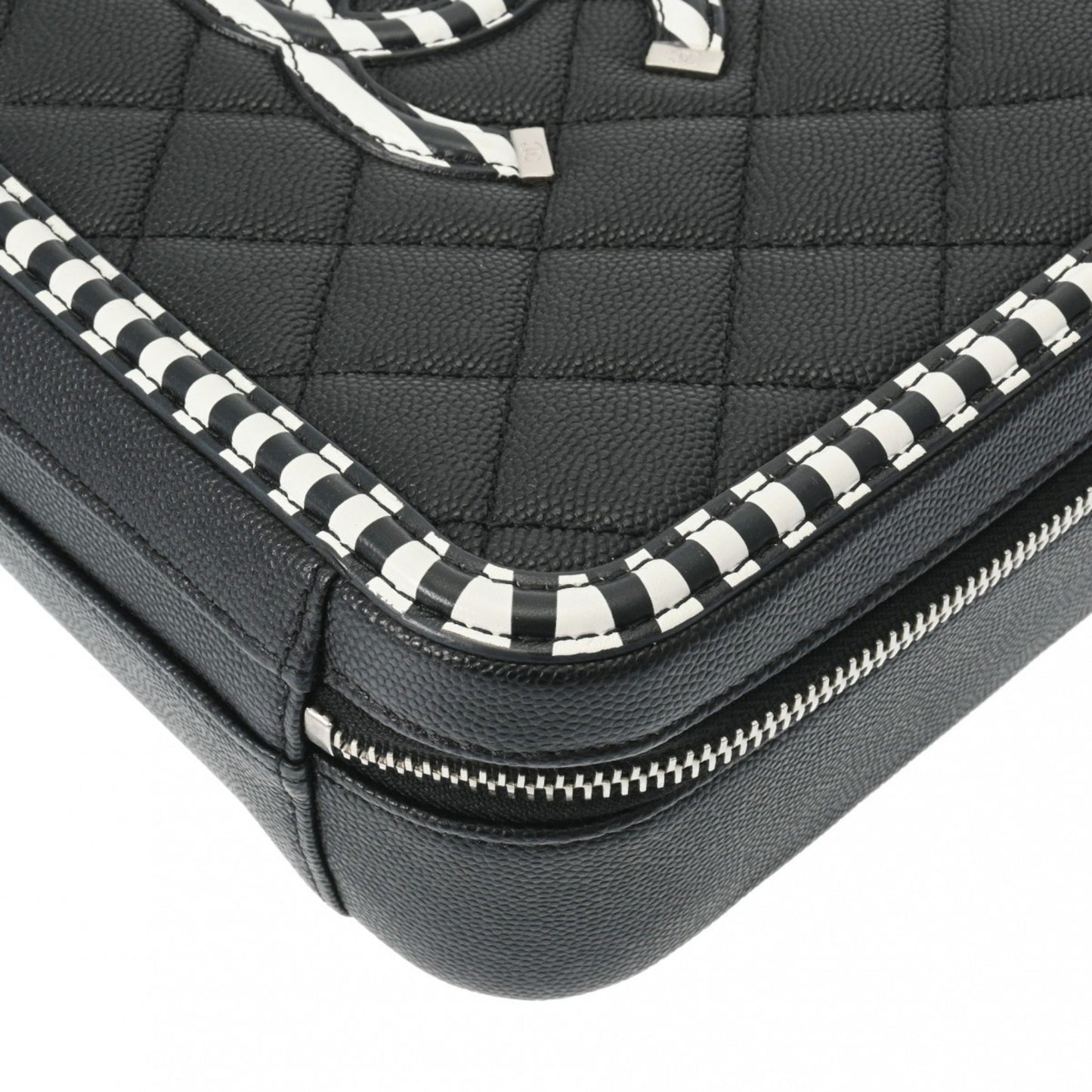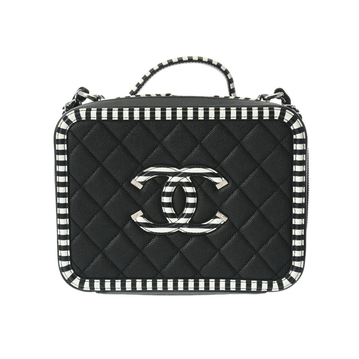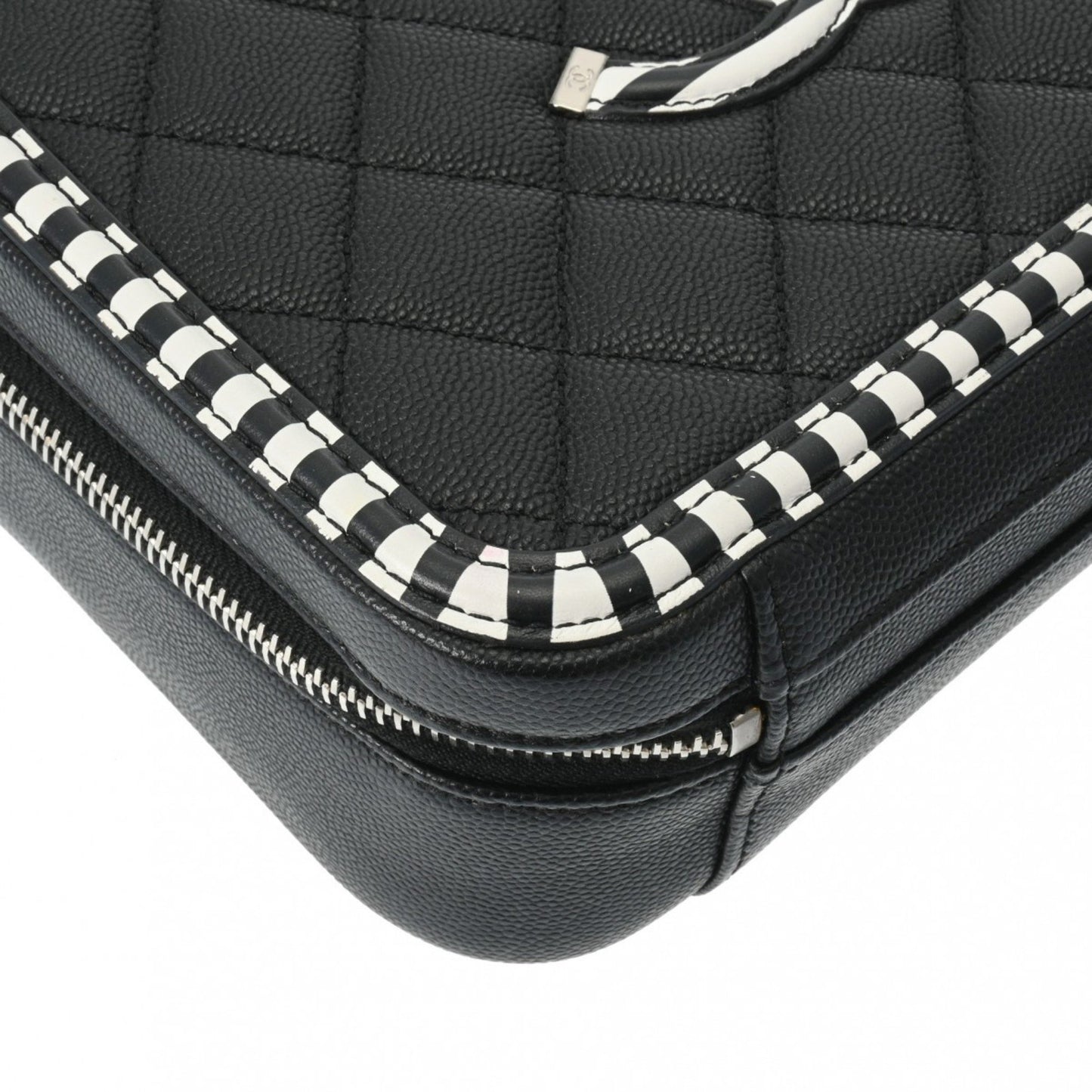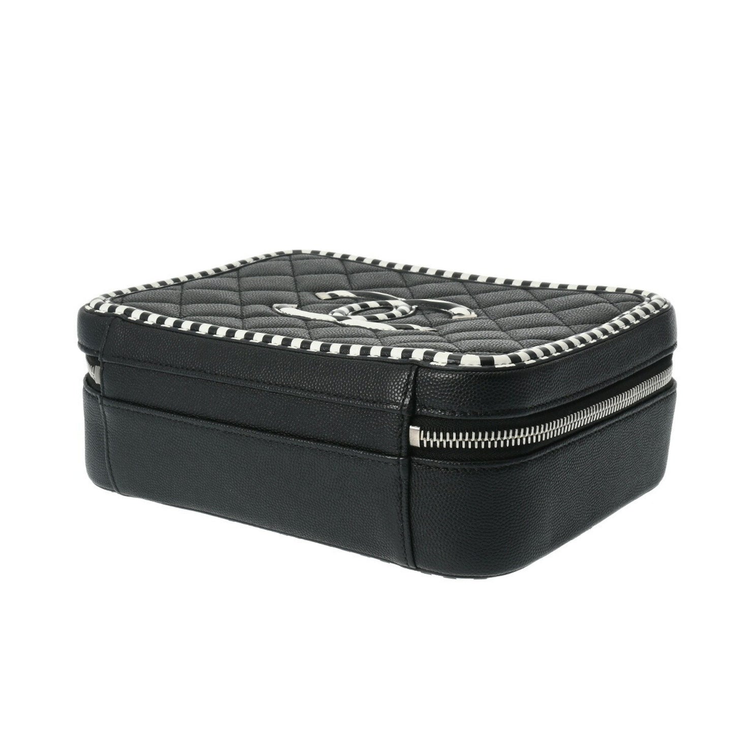 The Chanel CC Filgree handbag, also known as a vanity bag, is an iconic piece crafted from luxurious caviar leather in a classic black and white color combination. Its sophisticated design and high-quality material make it a timeless accessory for any wardrobe.