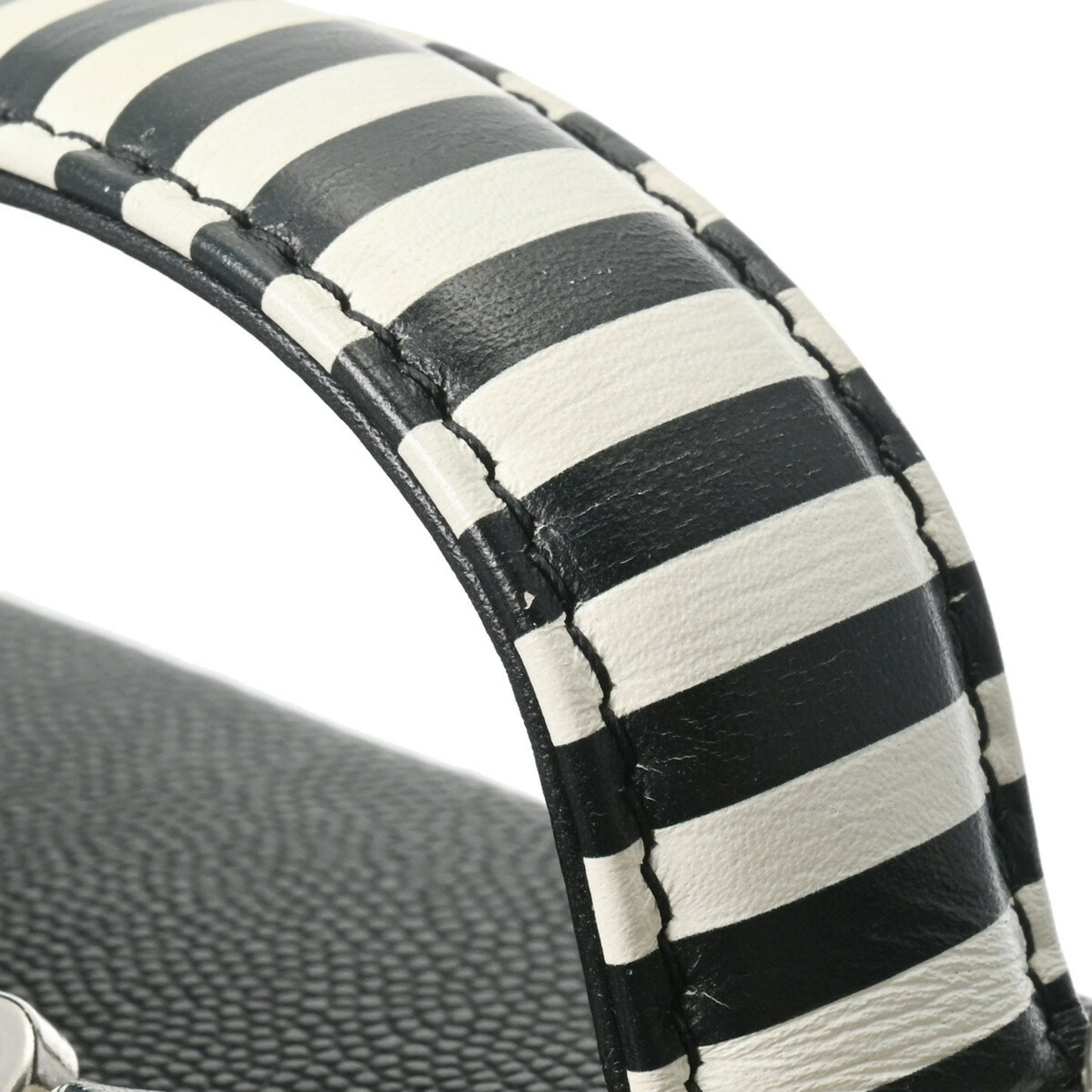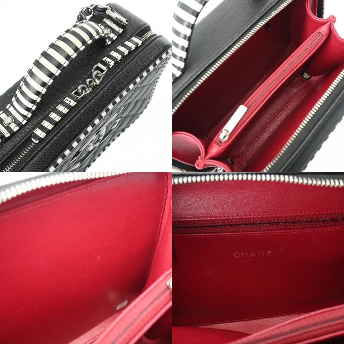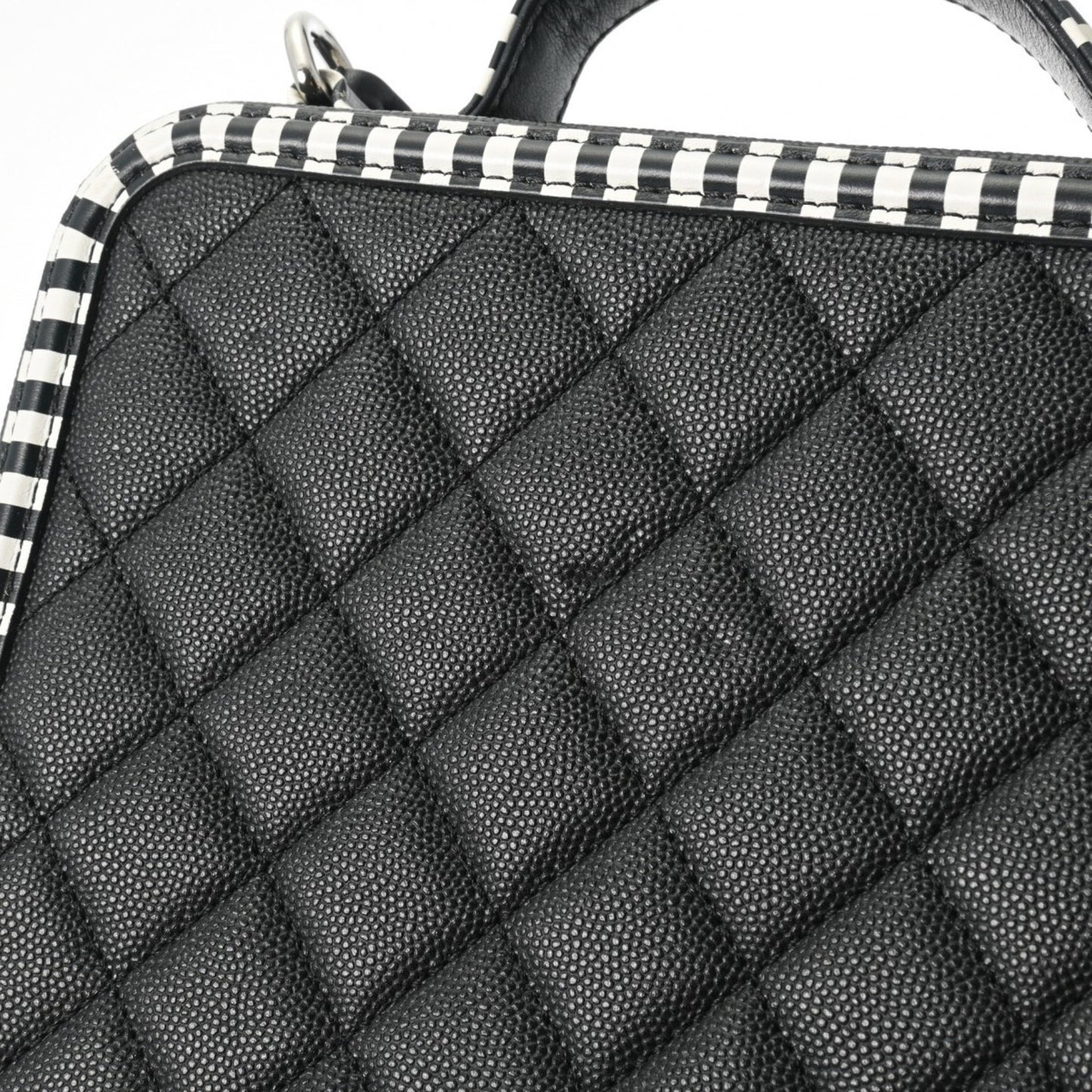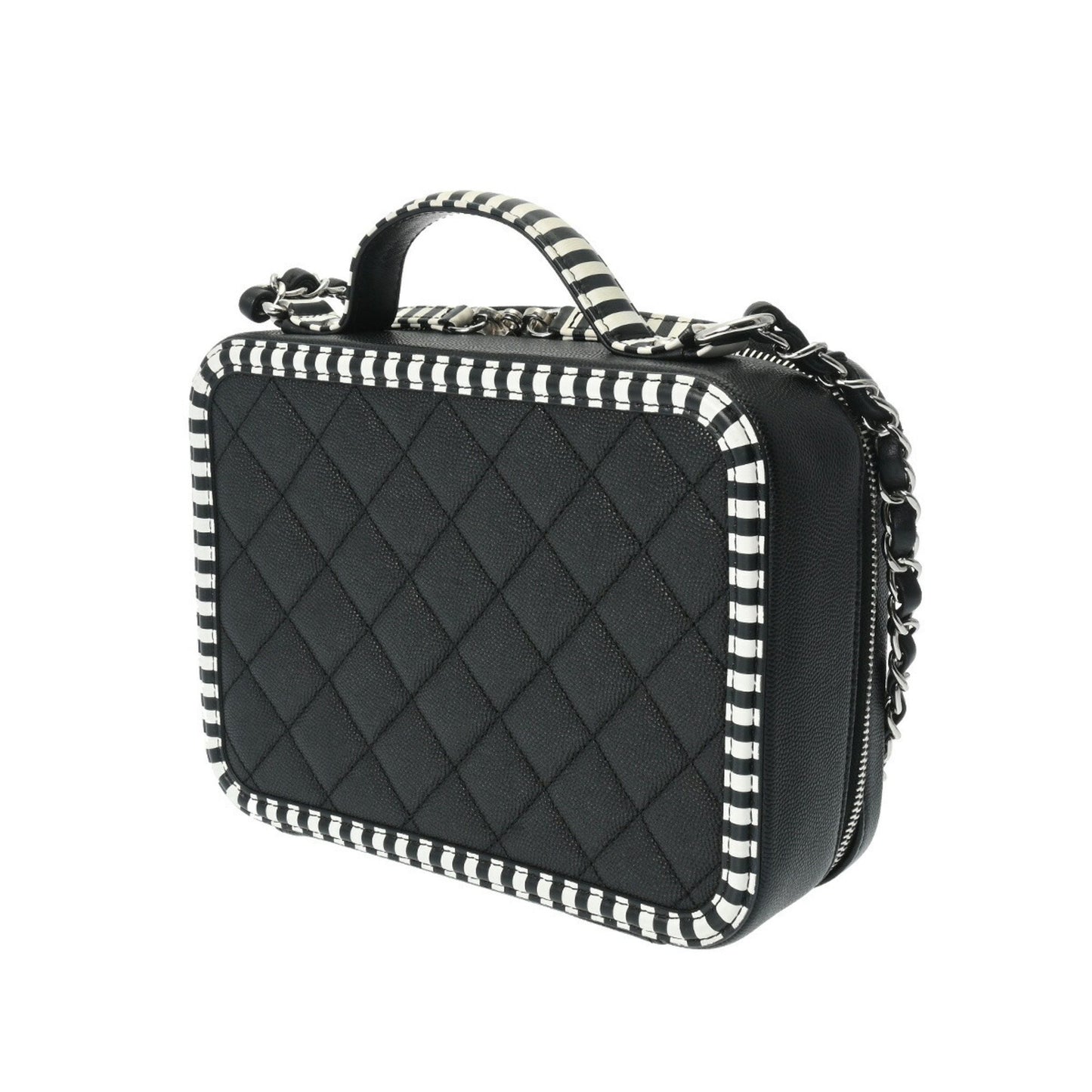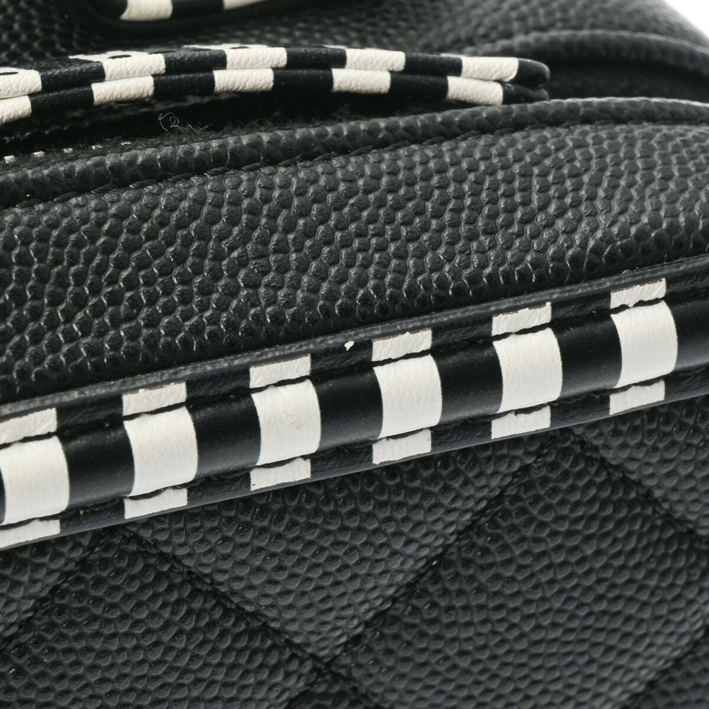 The Chanel CC Filgree handbag, also known as a vanity bag, is an iconic piece crafted from luxurious caviar leather in a classic black and white color combination. Its sophisticated design and high-quality material make it a timeless accessory for any wardrobe.