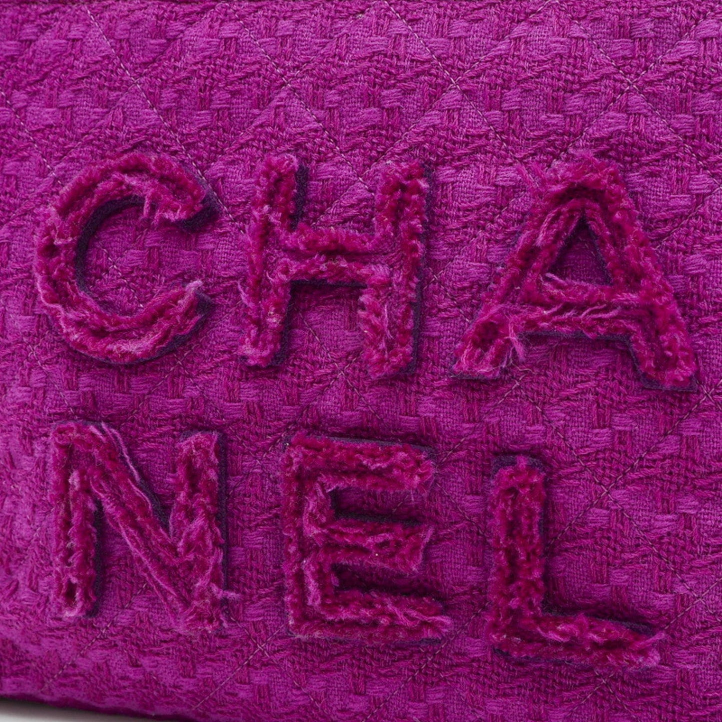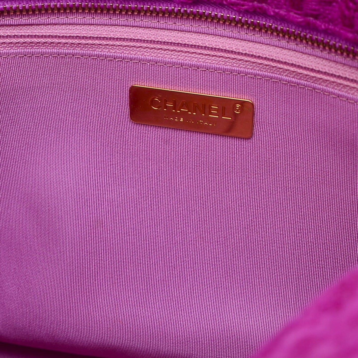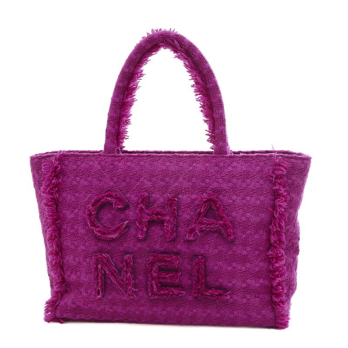 The Chanel Giant Logo handbag and tote bag is a stunning accessory, crafted from luxurious purple tweed. The bold design and high-quality material make it a standout addition to any wardrobe.