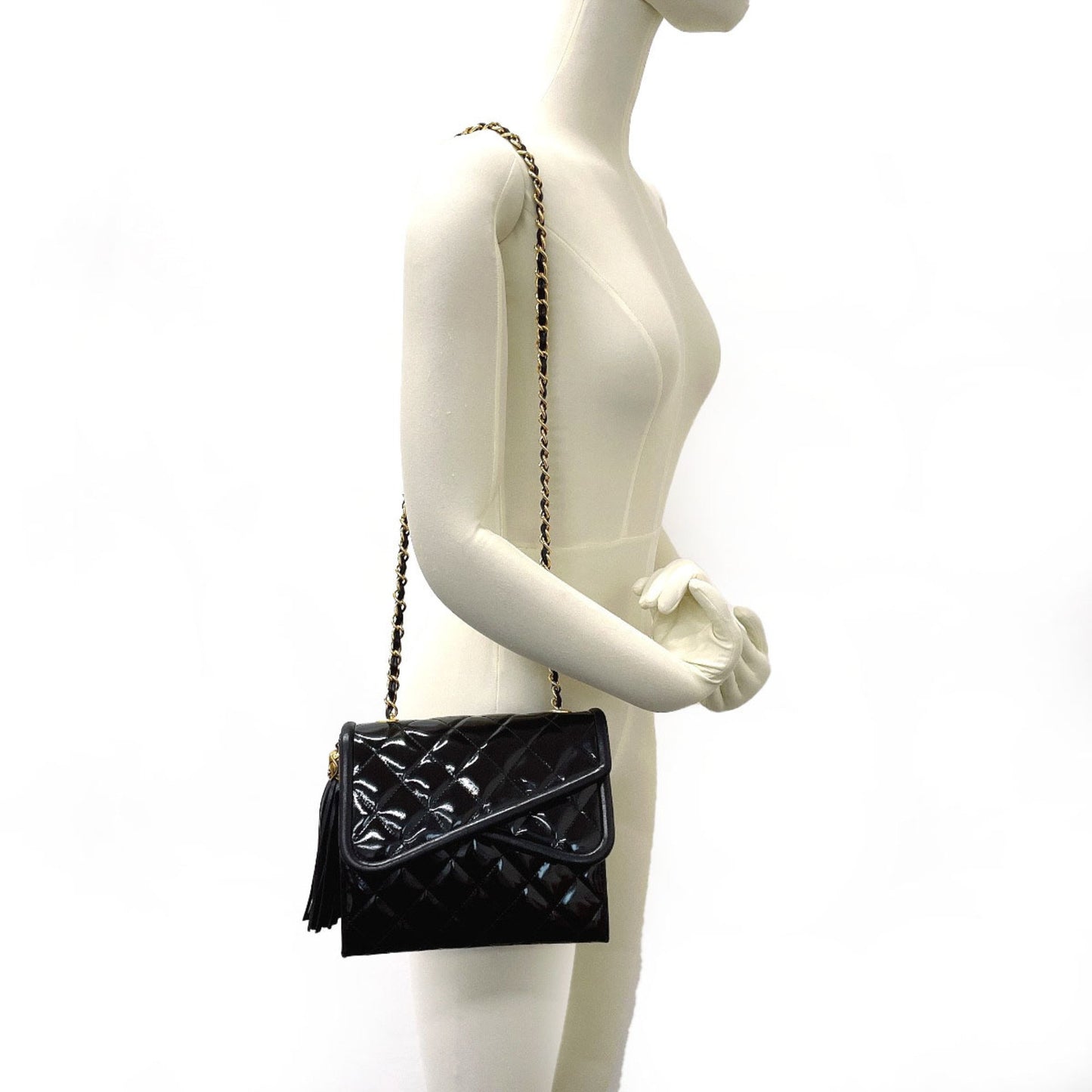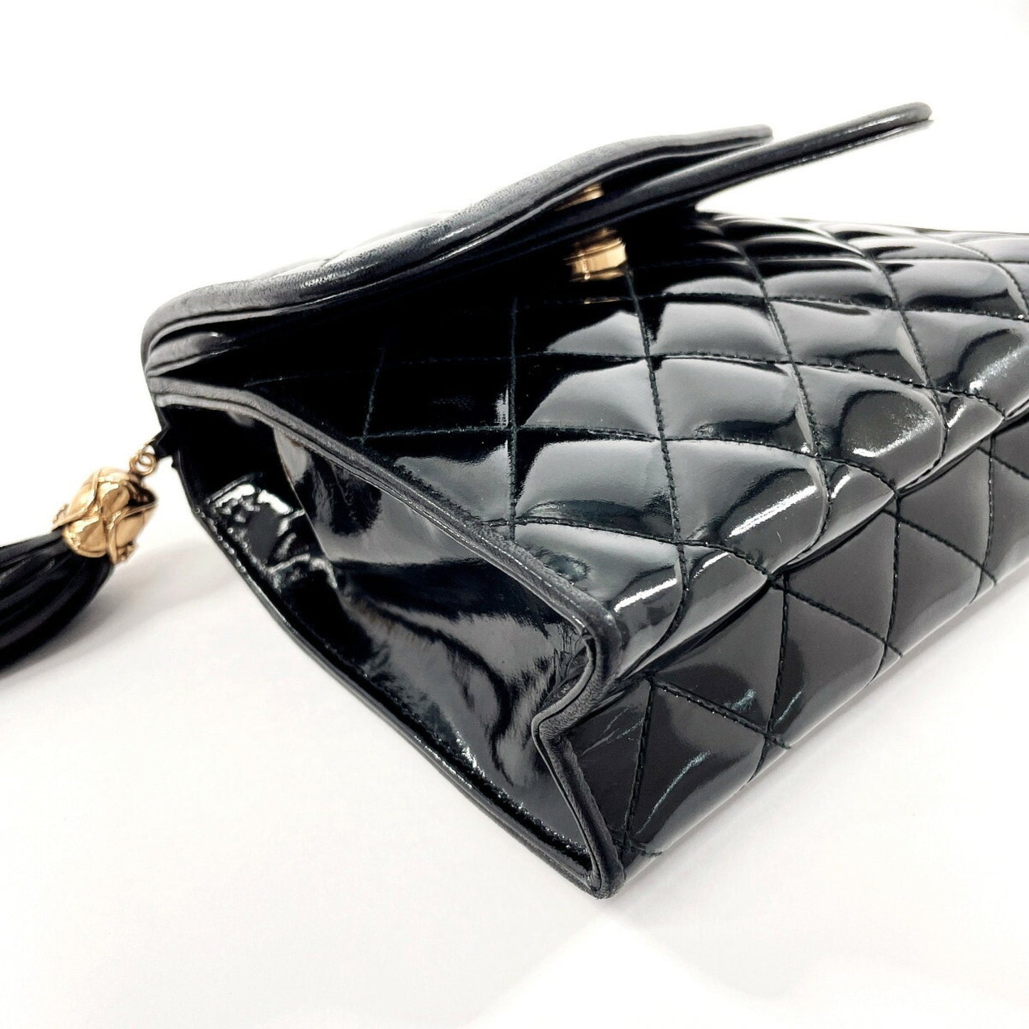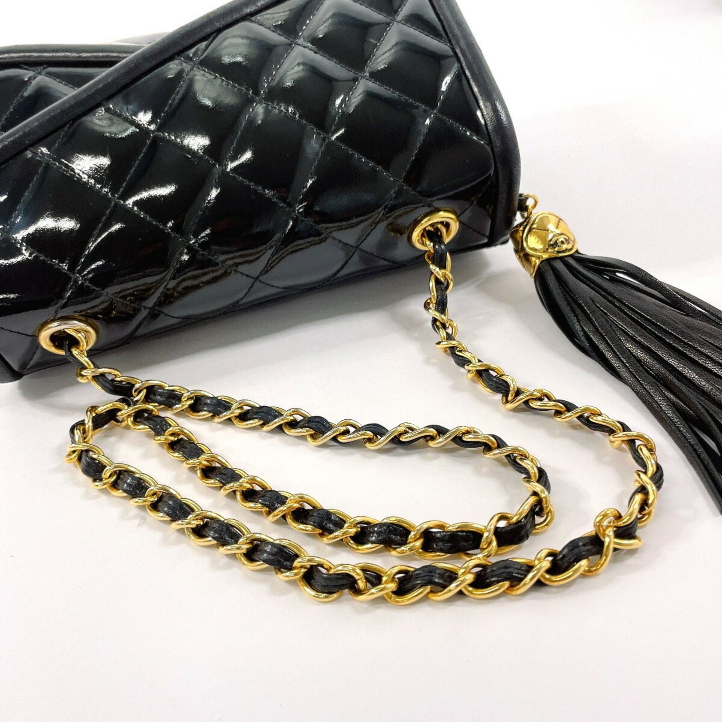 This Chanel Fringe Matelassé shoulder bag is a chic and stylish accessory designed for women. Crafted from black patent leather, it offers a sleek and sophisticated look.