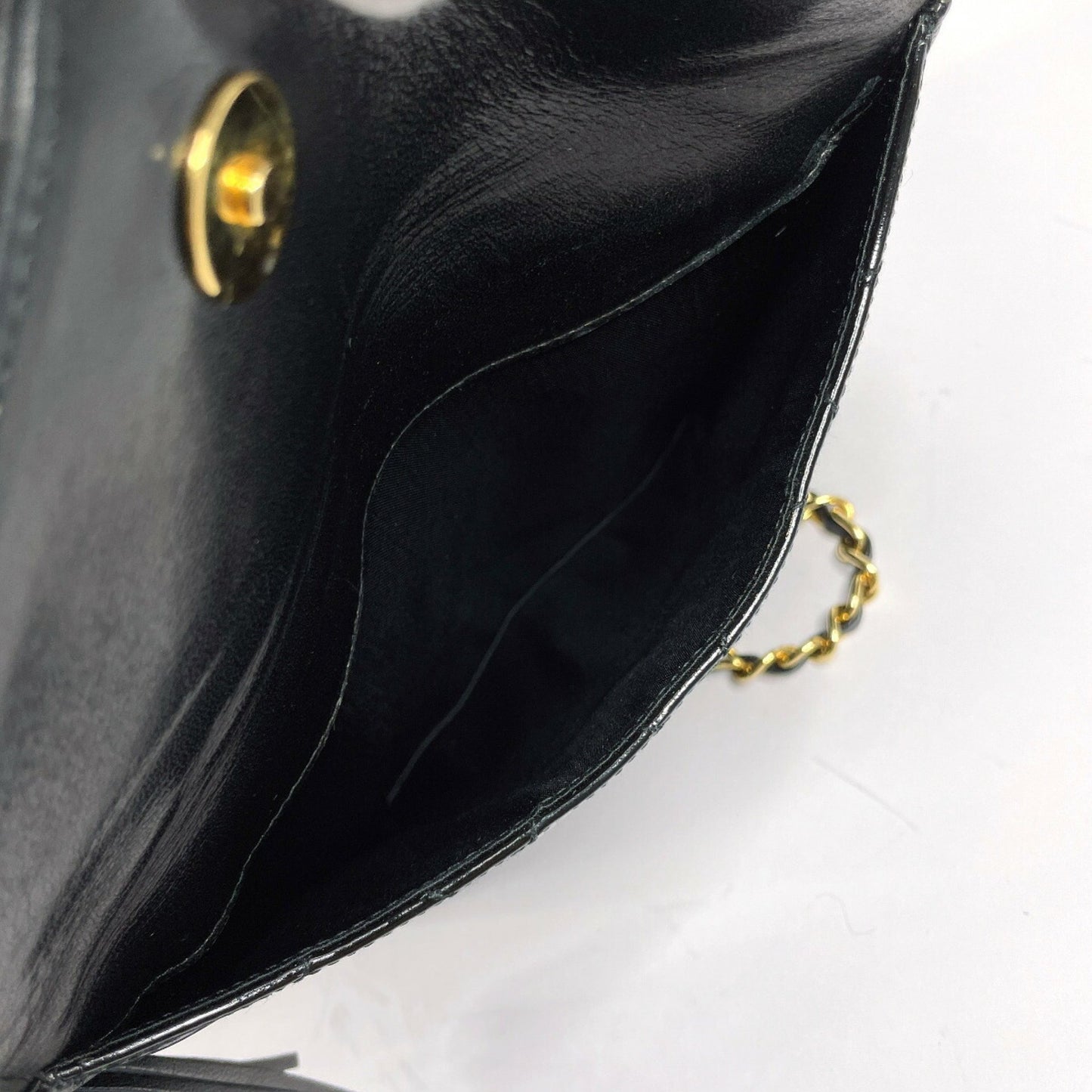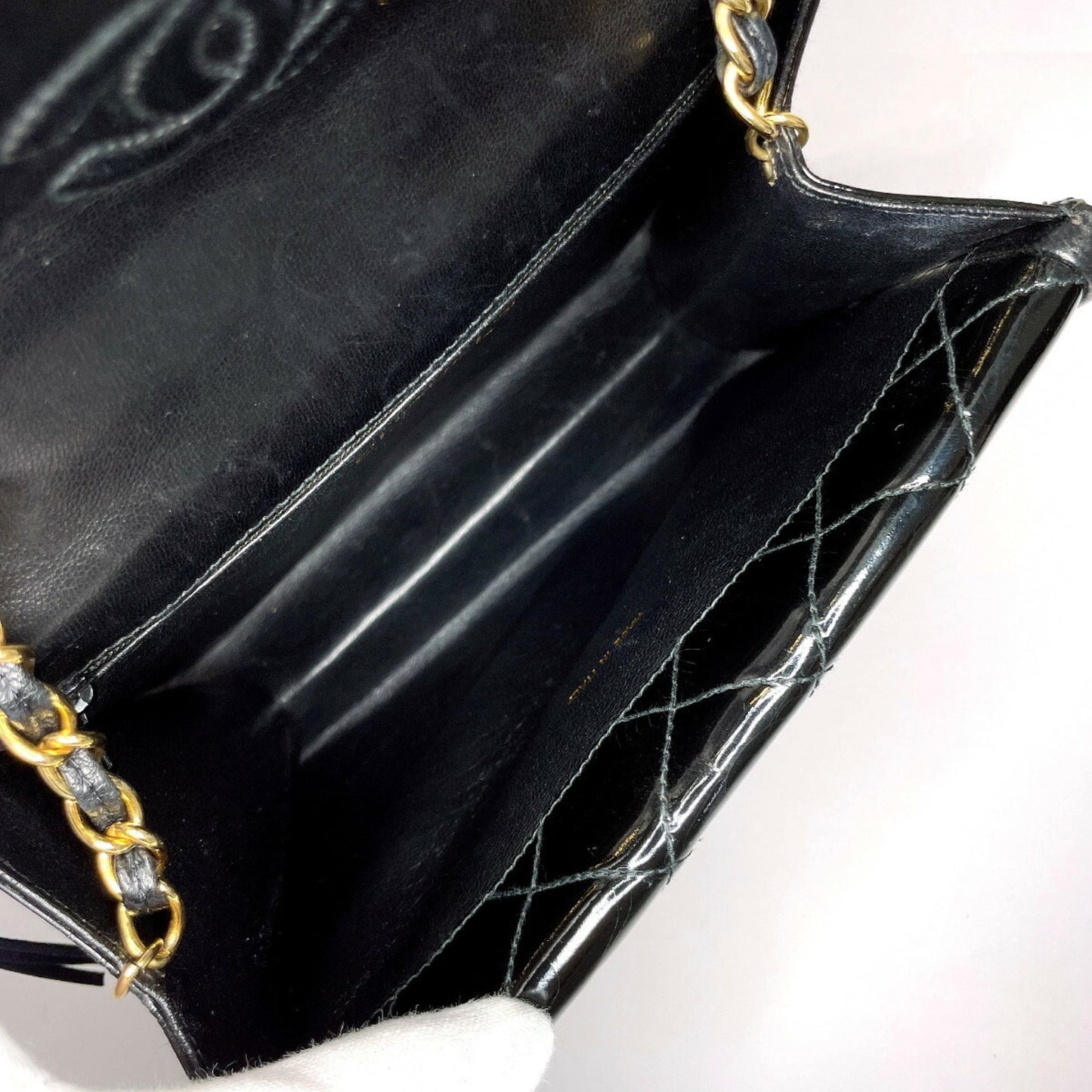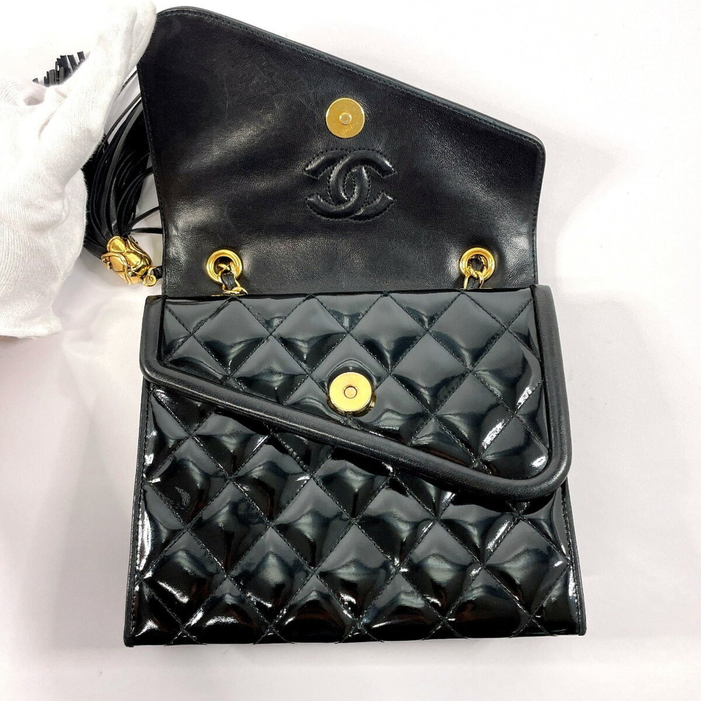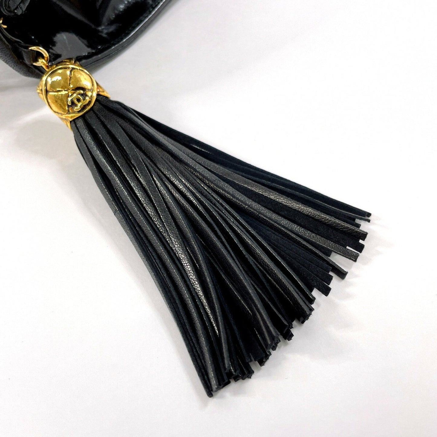 This Chanel Fringe Matelassé shoulder bag is a chic and stylish accessory designed for women. Crafted from black patent leather, it offers a sleek and sophisticated look.