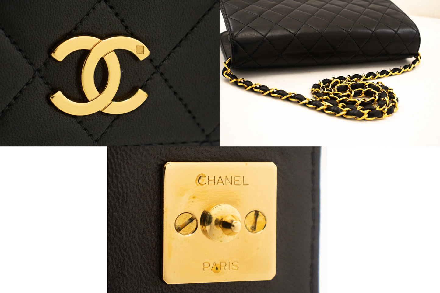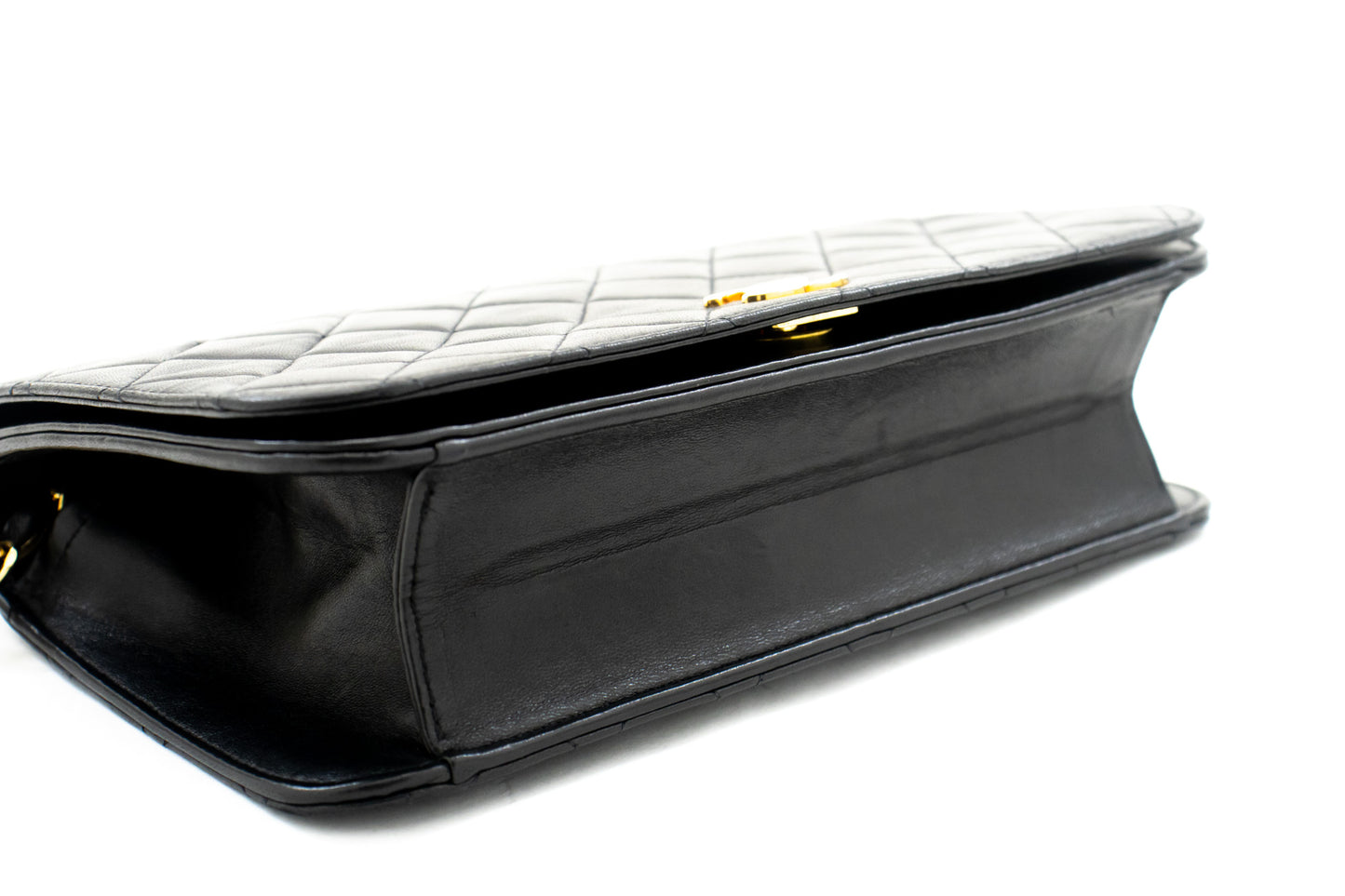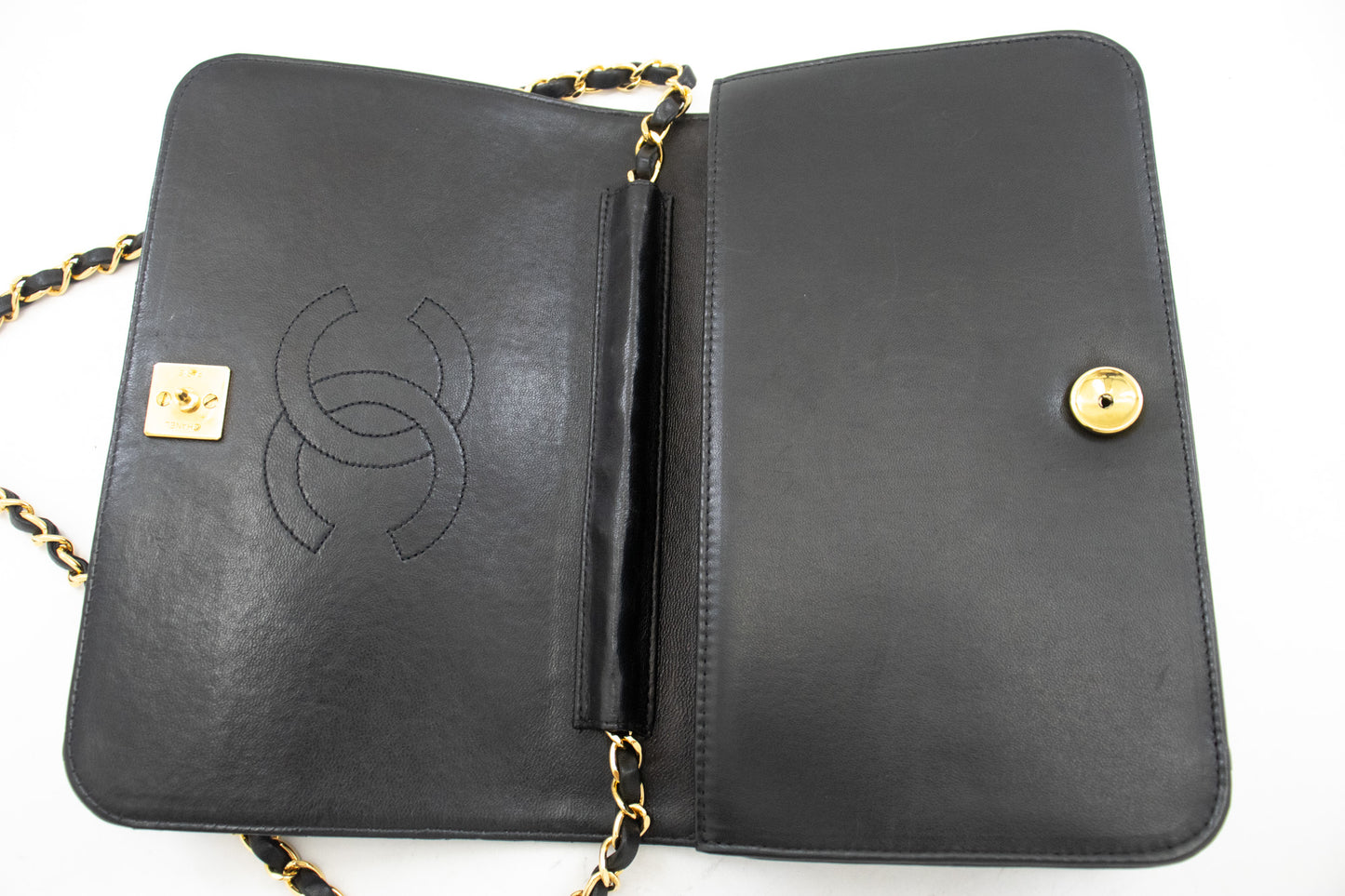 Introducing an authentic Chanel Full Flap Chain Shoulder Bag in sophisticated black quilted lambskin leather. This vintage classic, likely crafted between 1997 and 1999, features a solid pattern and is adorned with gold-tone hardware and chain accents.
