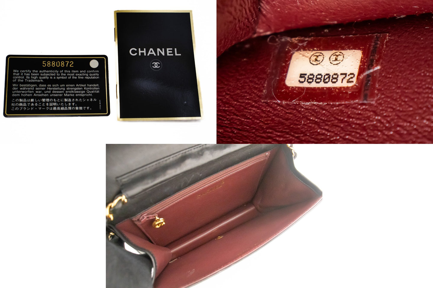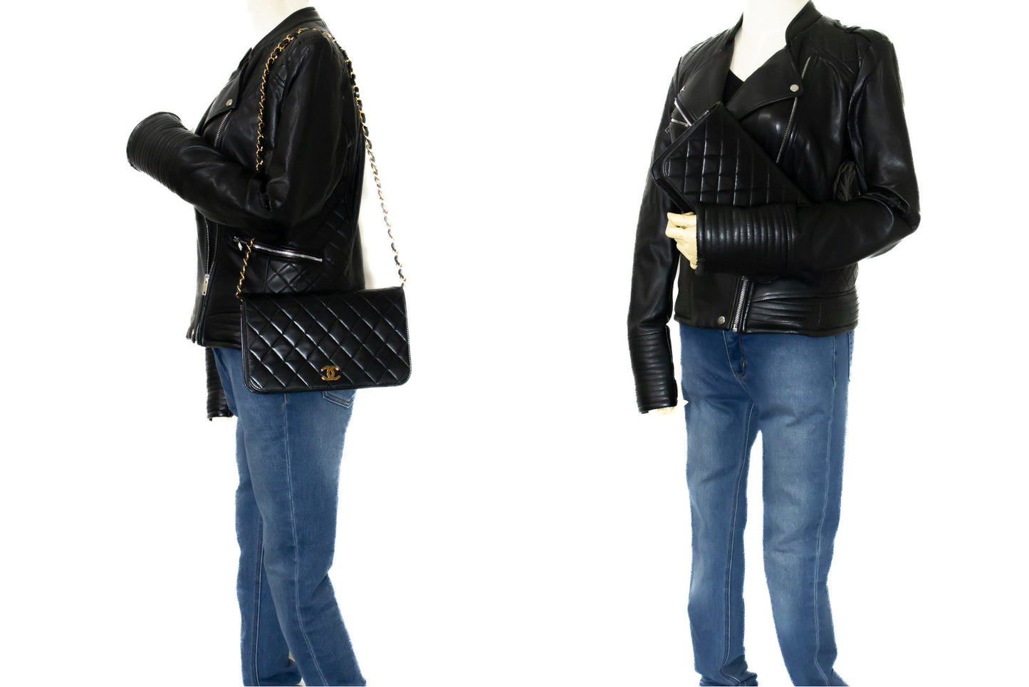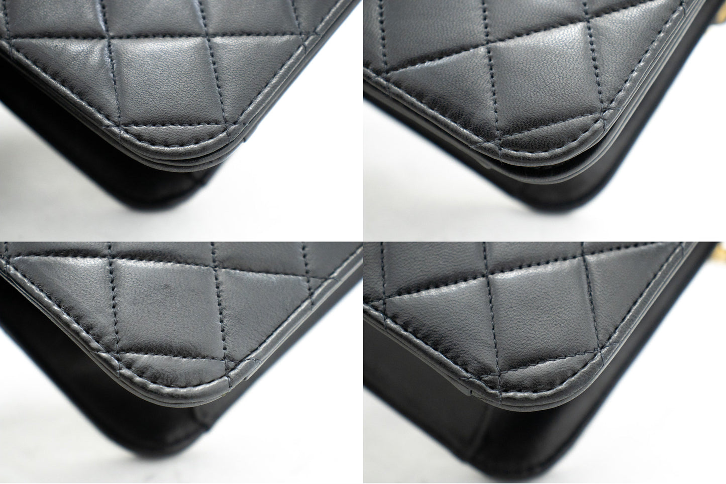Introducing an authentic Chanel Full Flap Chain Shoulder Bag in sophisticated black quilted lambskin leather. This vintage classic, likely crafted between 1997 and 1999, features a solid pattern and is adorned with gold-tone hardware and chain accents.
