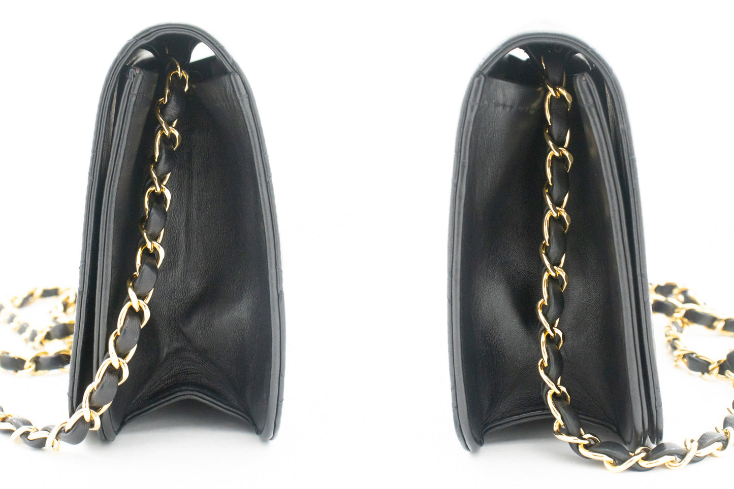 The exterior shows minimal signs of use, with only very slight scratches. The interior is equally impressive, showcasing cleanliness and slight scratches without any stickiness or peeling. All chains and hardware components shine brilliantly, underscoring the bag's enduring allure and collectible status.