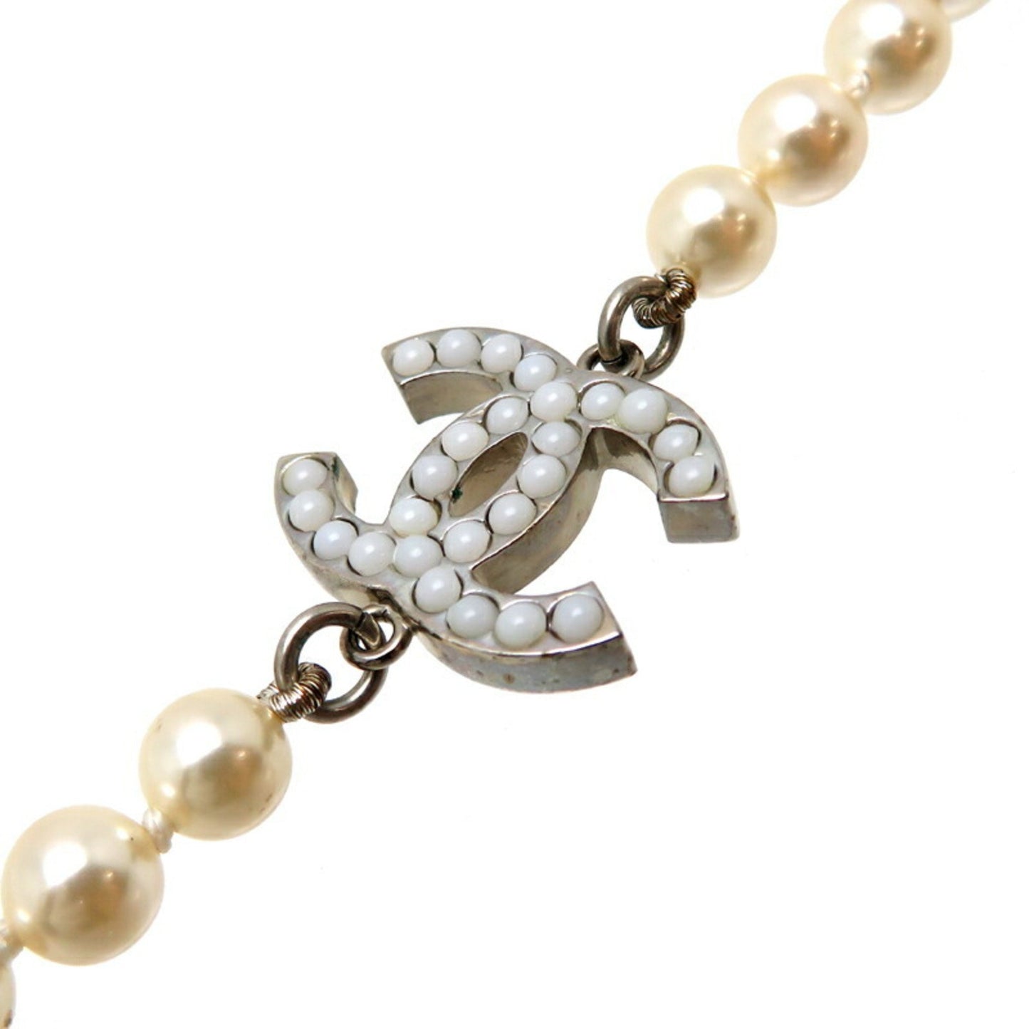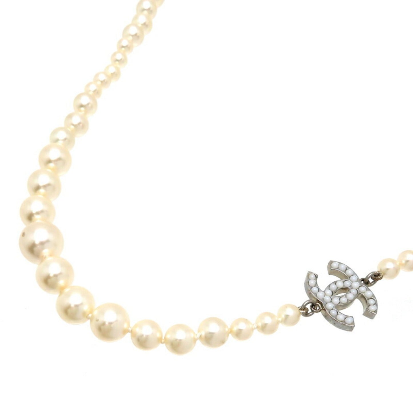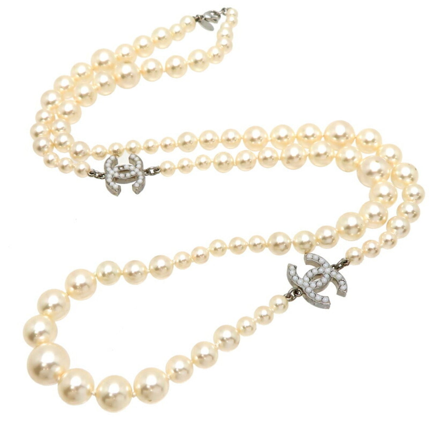 The Chanel necklace features a sophisticated design with silver and ecru tones, combining metal and pearl elements. Its elegant color scheme and high-quality materials make it a refined accessory for any outfit.