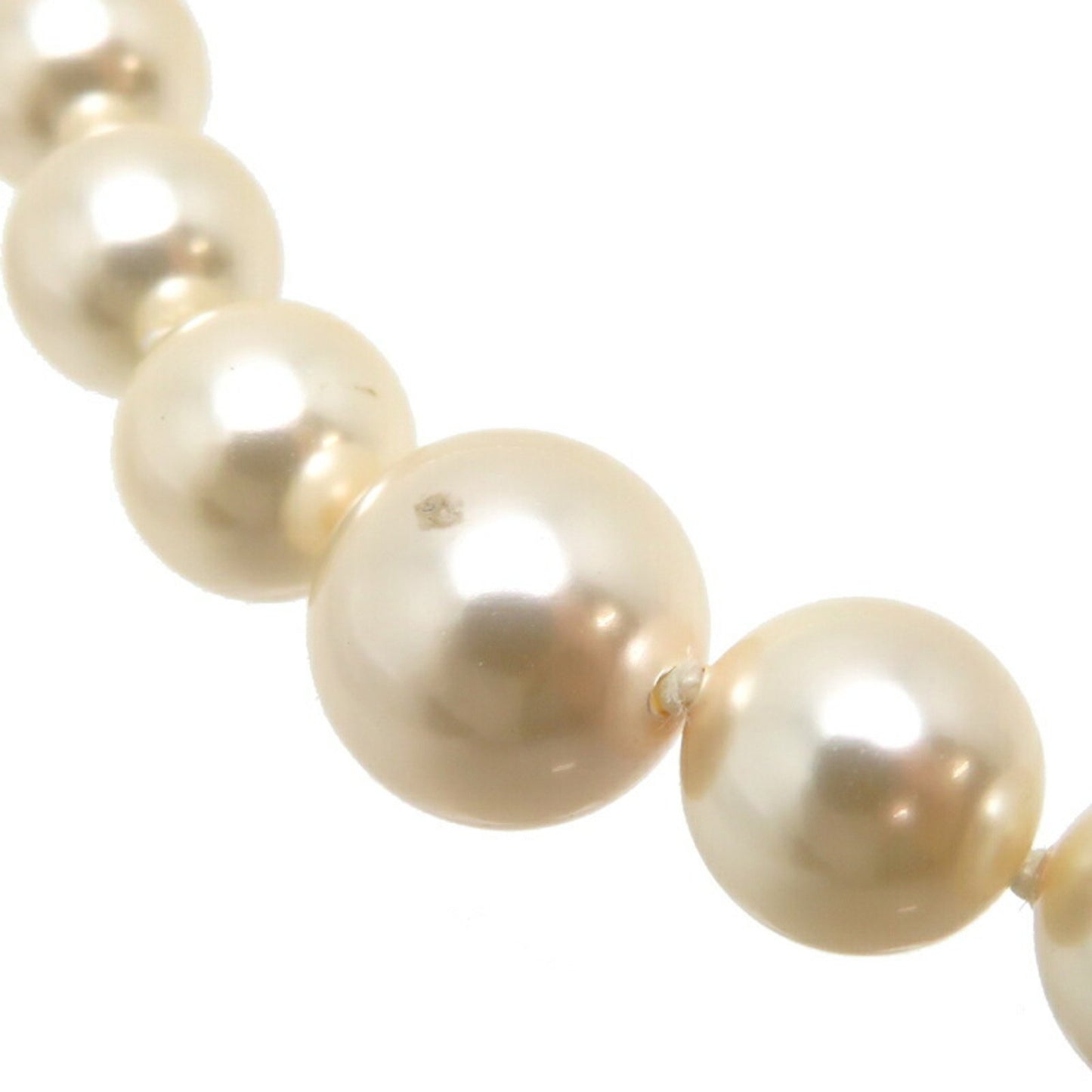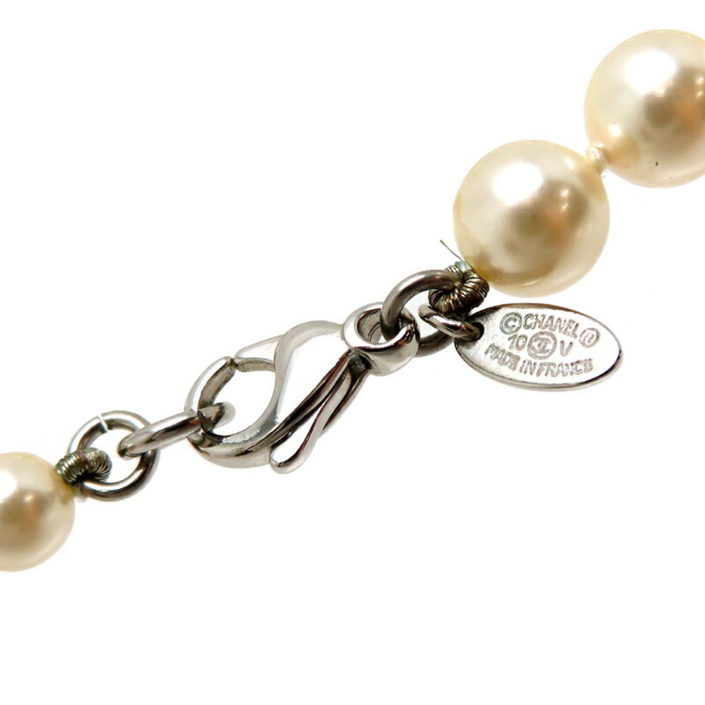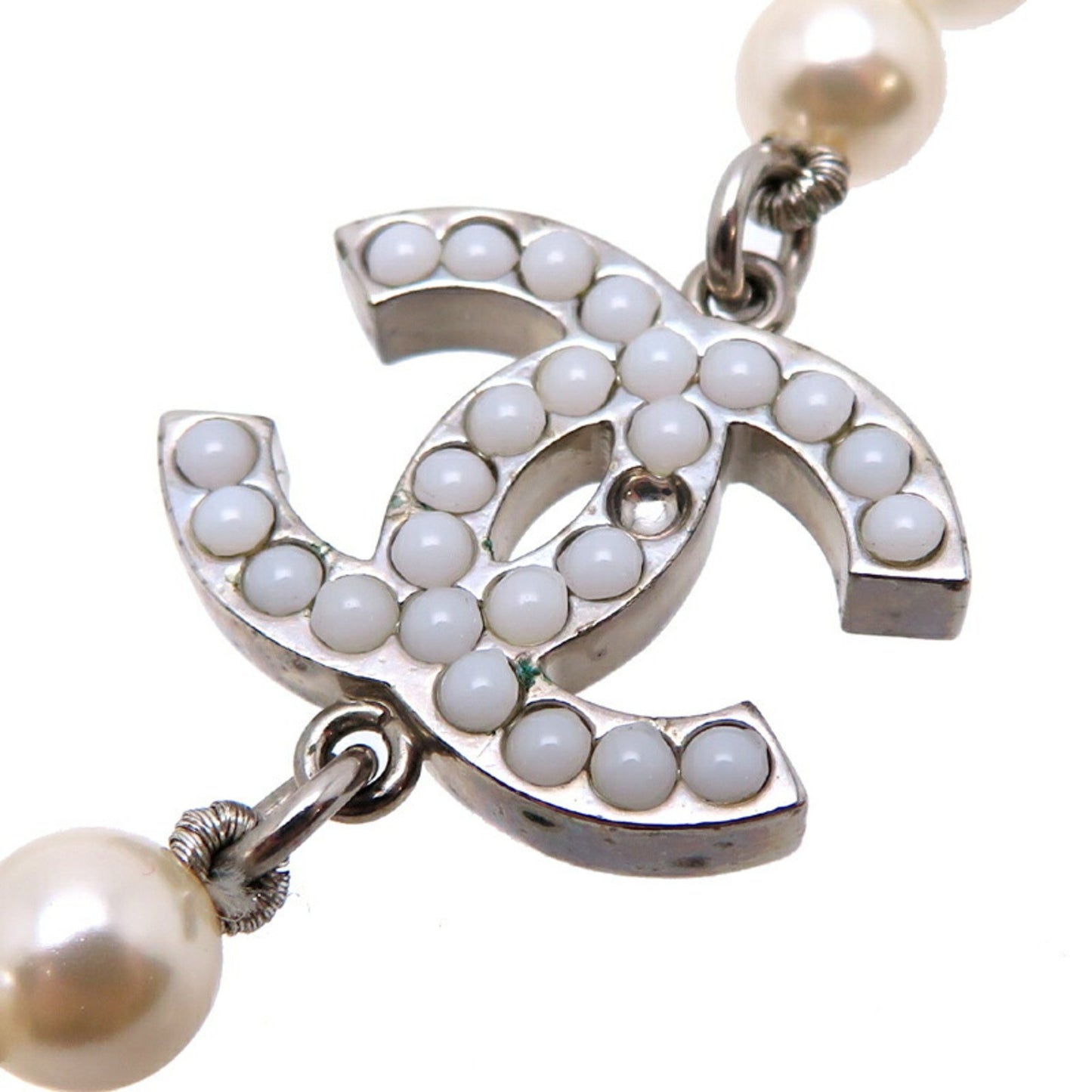 The Chanel necklace features a sophisticated design with silver and ecru tones, combining metal and pearl elements. Its elegant color scheme and high-quality materials make it a refined accessory for any outfit.