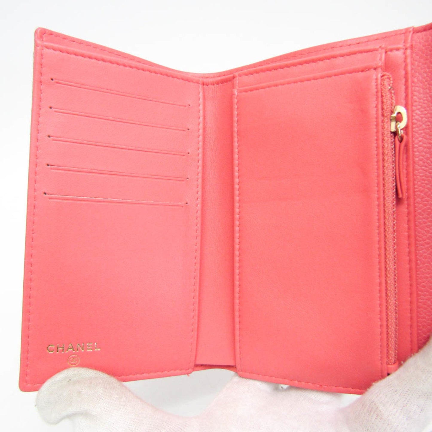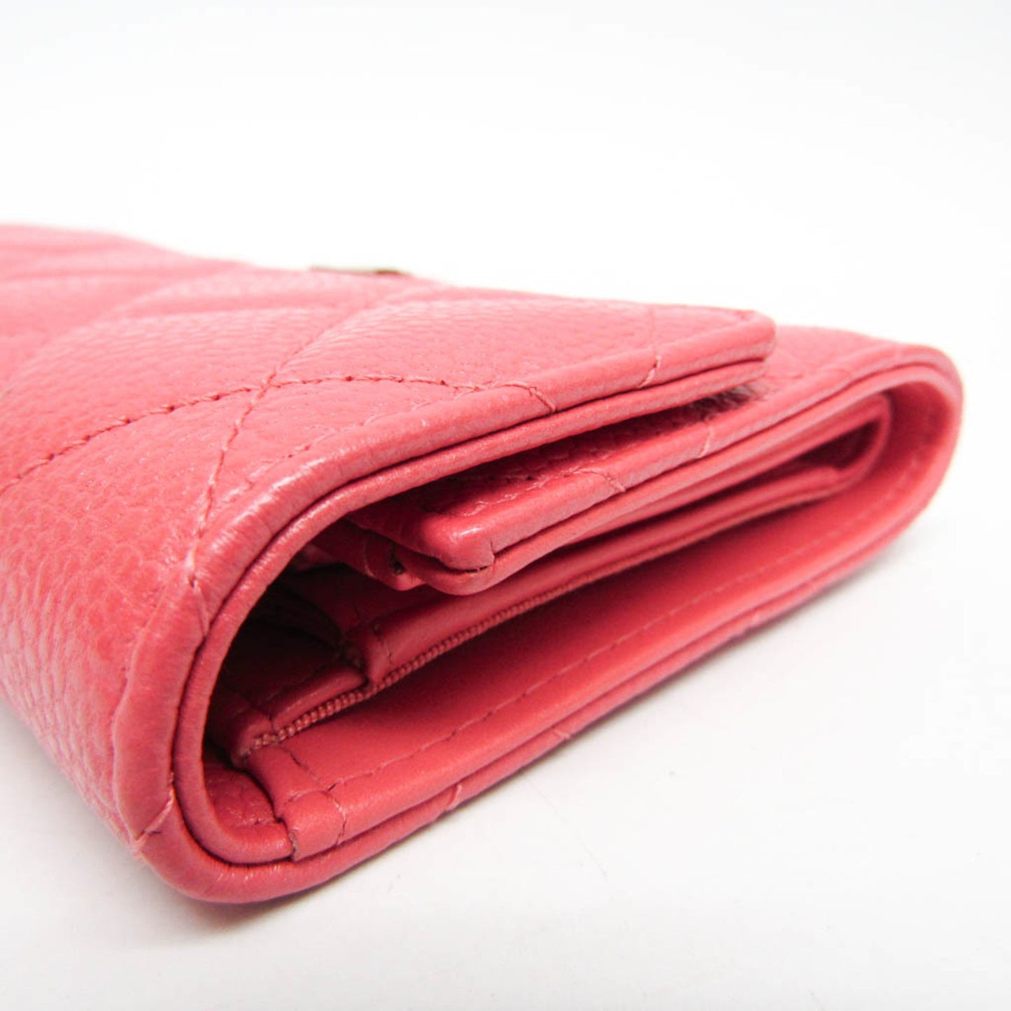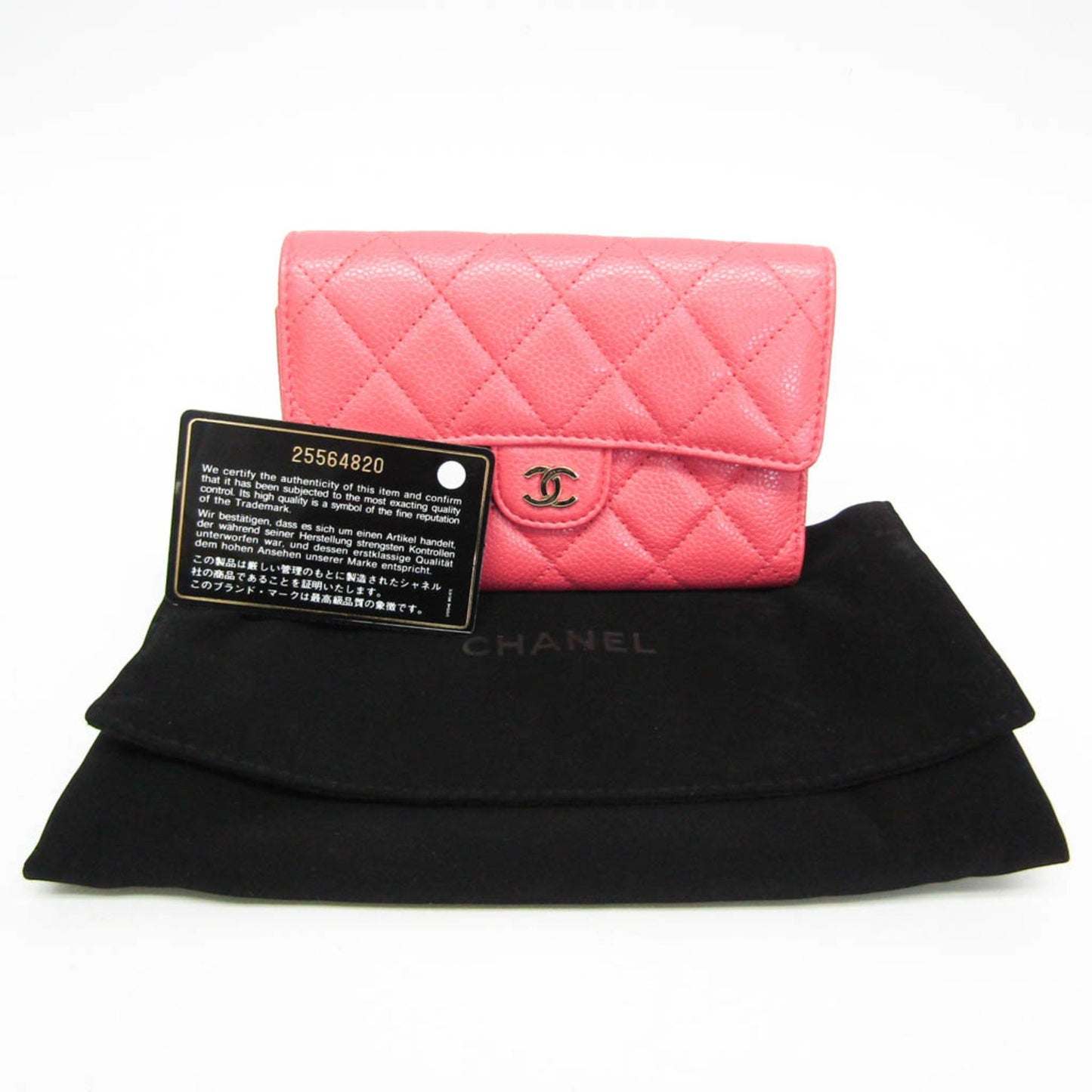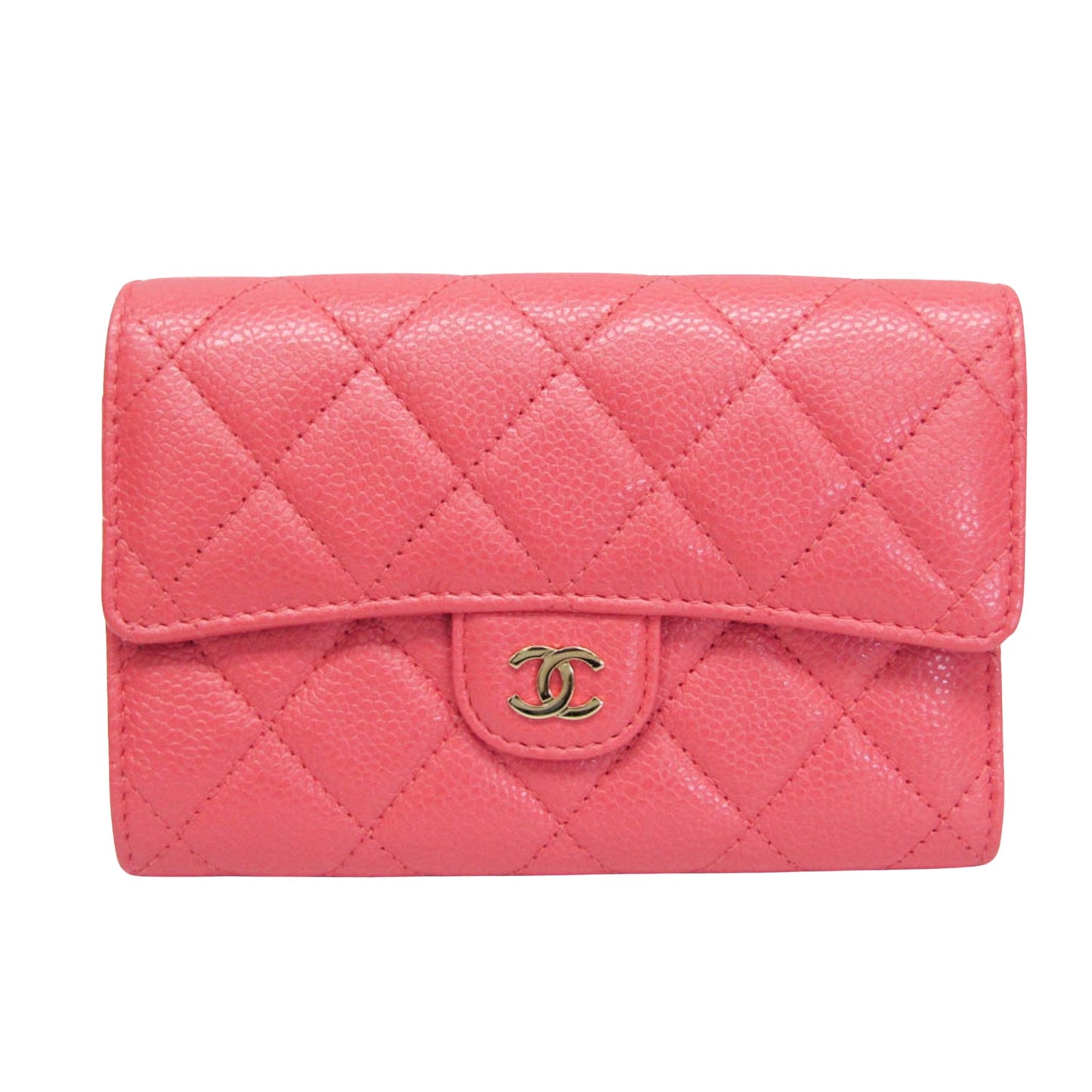 This Chanel Matelassé middle wallet is a chic tri-fold accessory designed for women. Made in Italy from pink caviar leather, it offers a blend of elegance and durability.