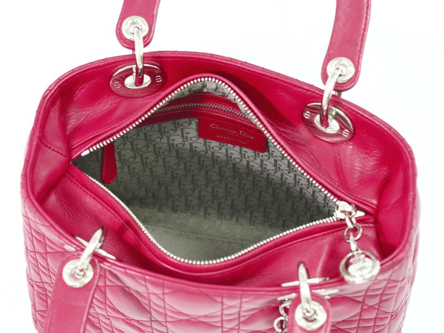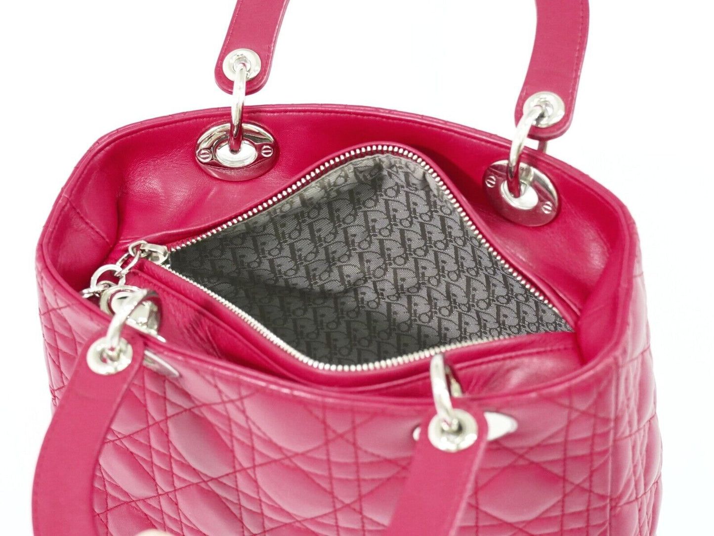 The Lady Dior 2-way bag in pink leather, made in Italy by Christian Dior, is an iconic accessory combining elegance and functionality. This medium-sized bag, intended for women, is distinguished by its Dior Cannage pattern and details in silver material. Designed to be worn by hand or on the shoulder, it perfectly embodies the luxury and know-how of the Dior house.