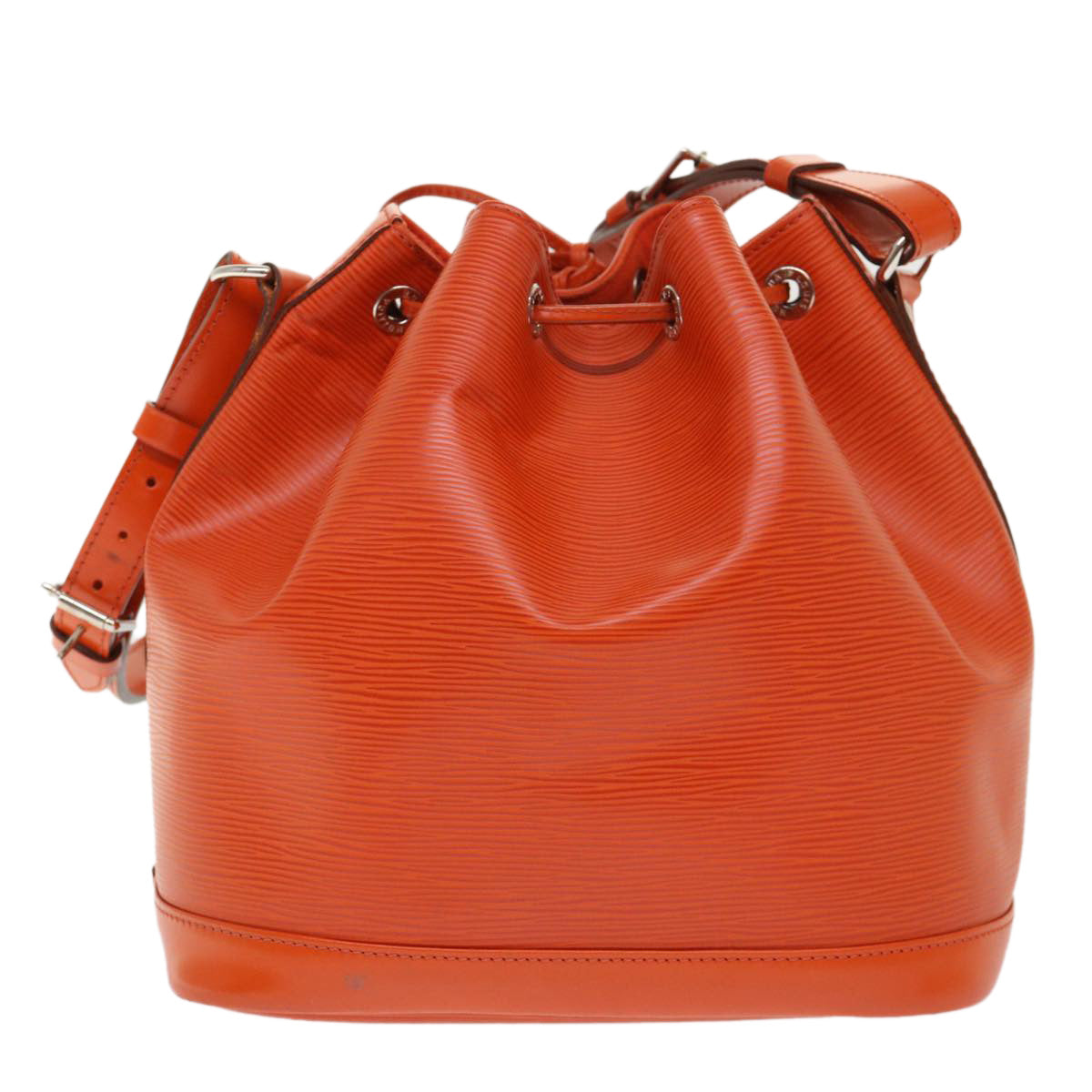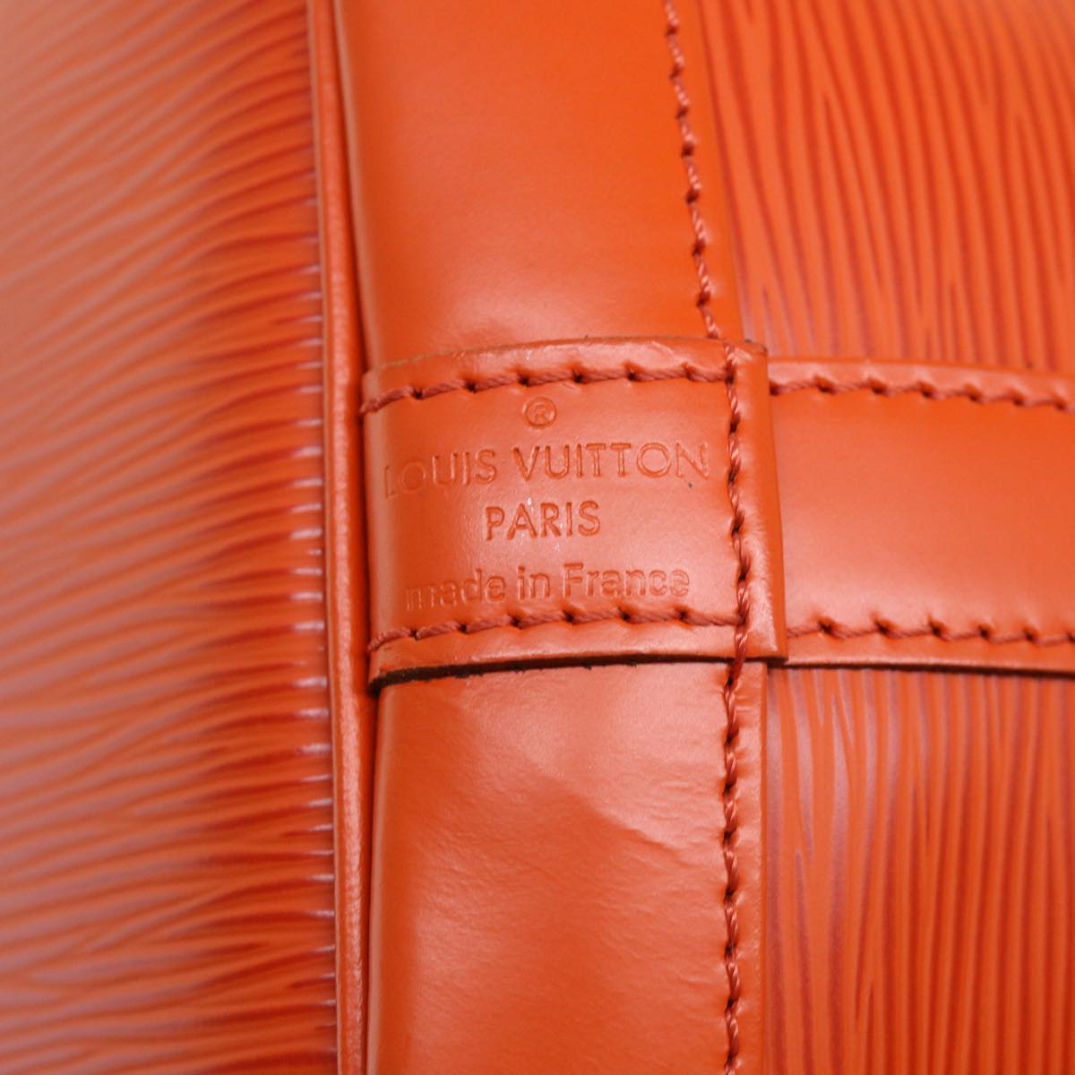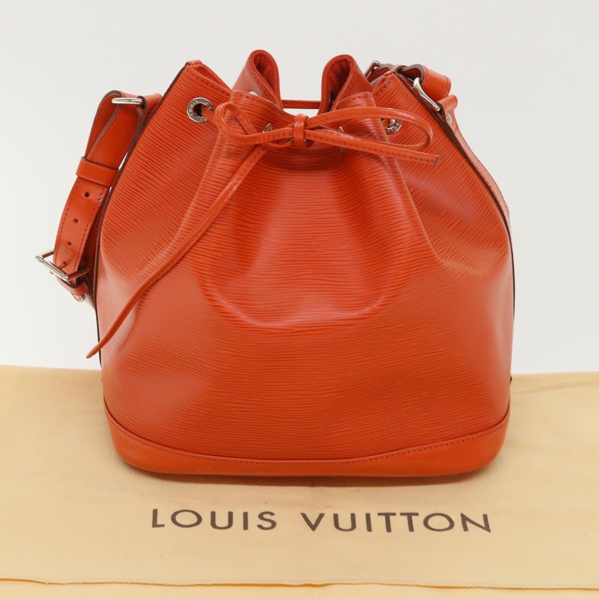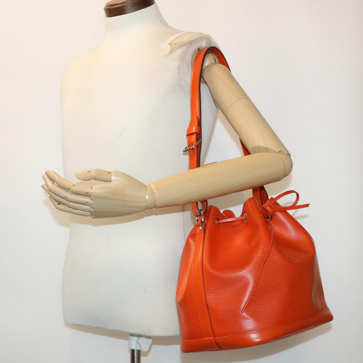 The renowned Louis Vuitton Petit Noé handbag is crafted from orange epi leather, adorned with gold-tone metal accents, and features an adjustable orange leather shoulder strap for both handheld and shoulder carrying. It is closed using a leather drawstring and boasts an interior lined with orange suede. This iconic handbag combines style and practicality, making it a versatile accessory for various occasions.