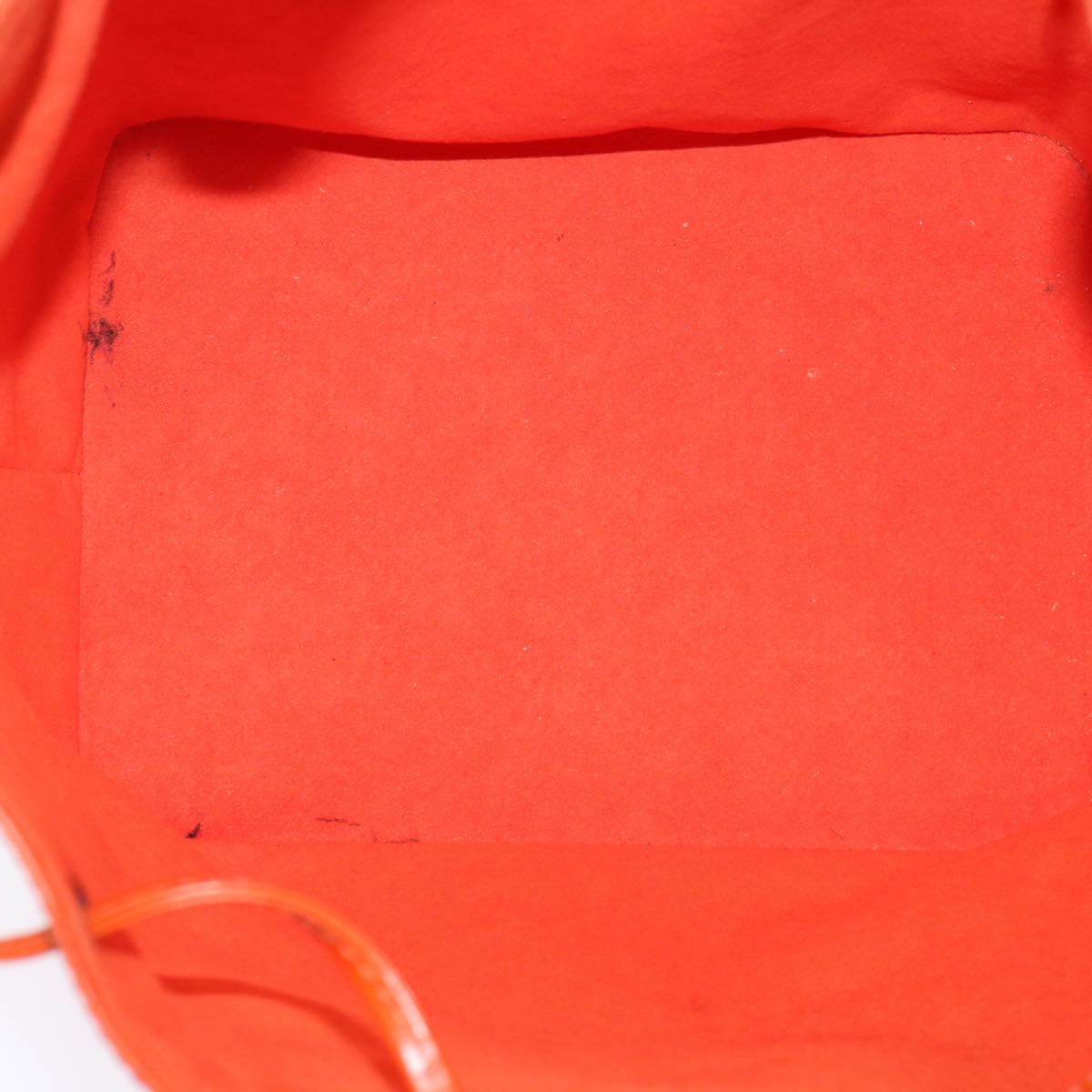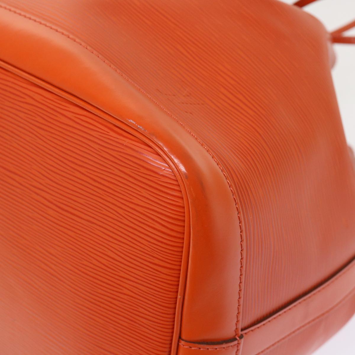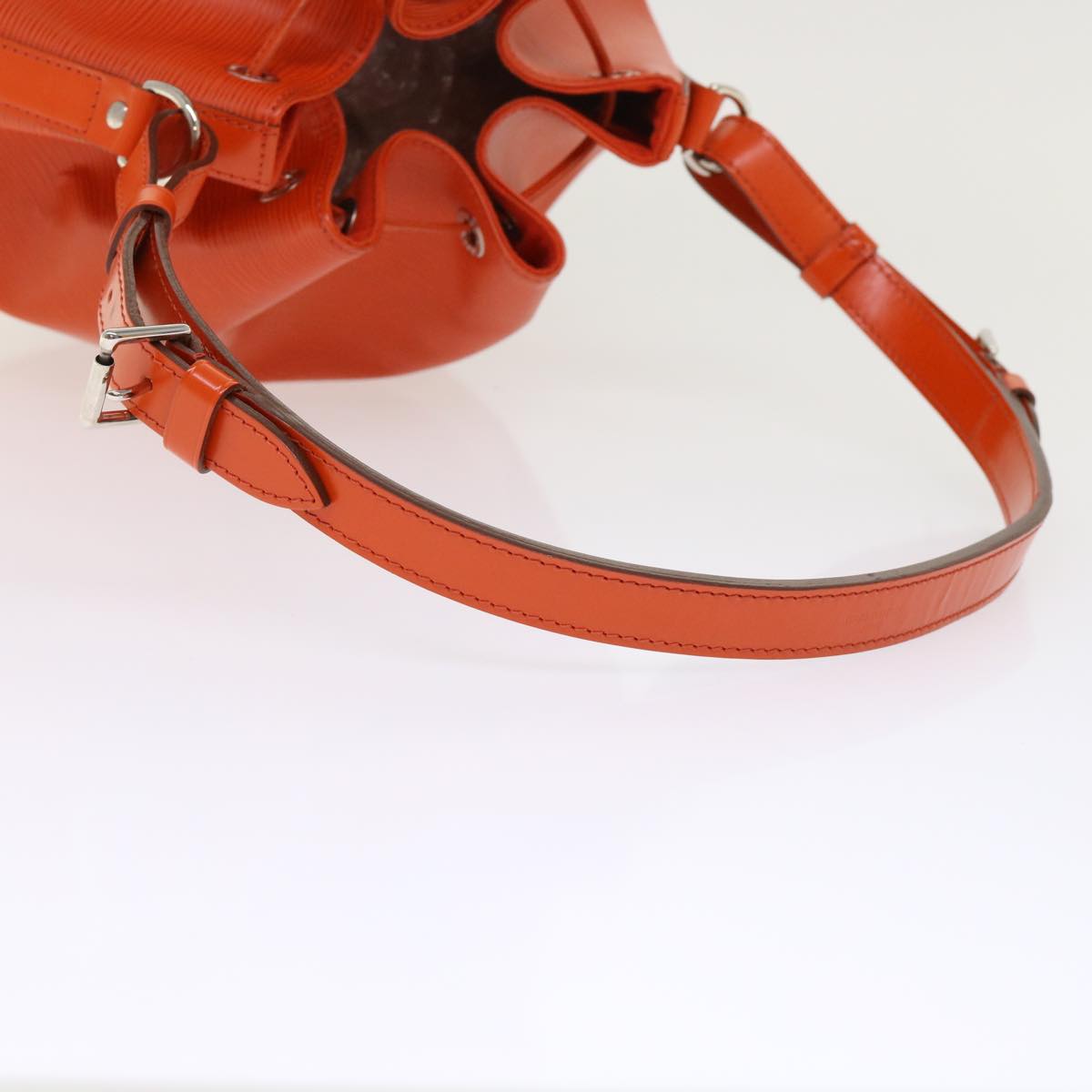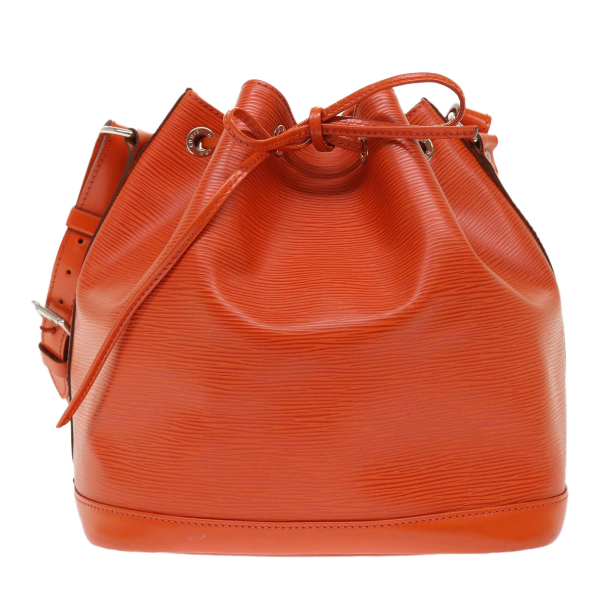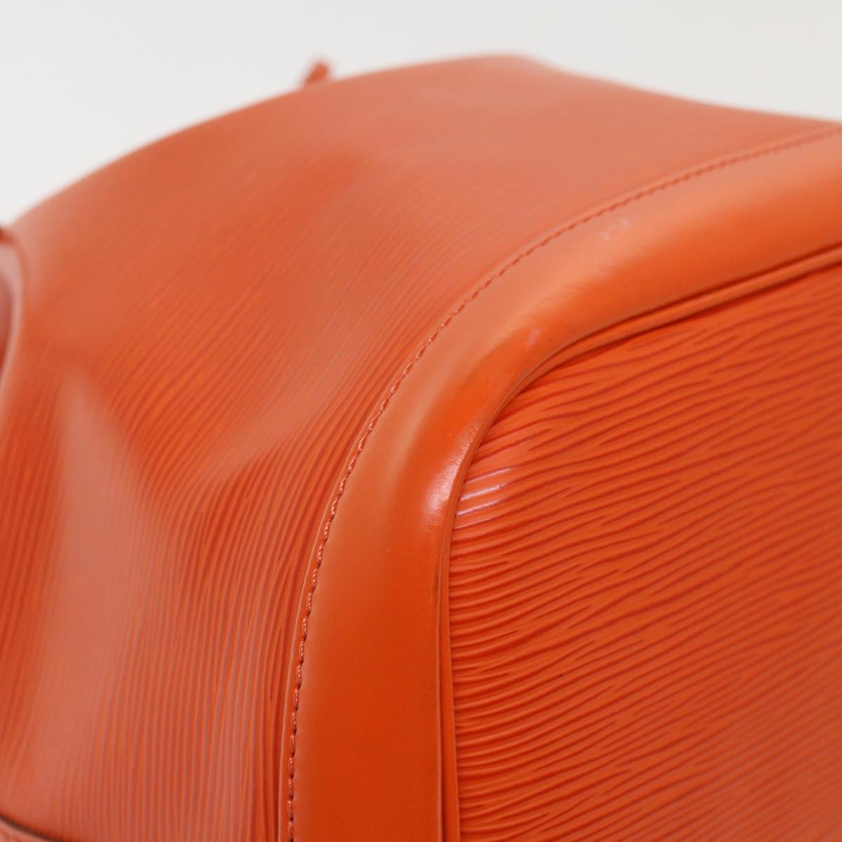 The renowned Louis Vuitton Petit Noé handbag is crafted from orange epi leather, adorned with gold-tone metal accents, and features an adjustable orange leather shoulder strap for both handheld and shoulder carrying. It is closed using a leather drawstring and boasts an interior lined with orange suede. This iconic handbag combines style and practicality, making it a versatile accessory for various occasions.