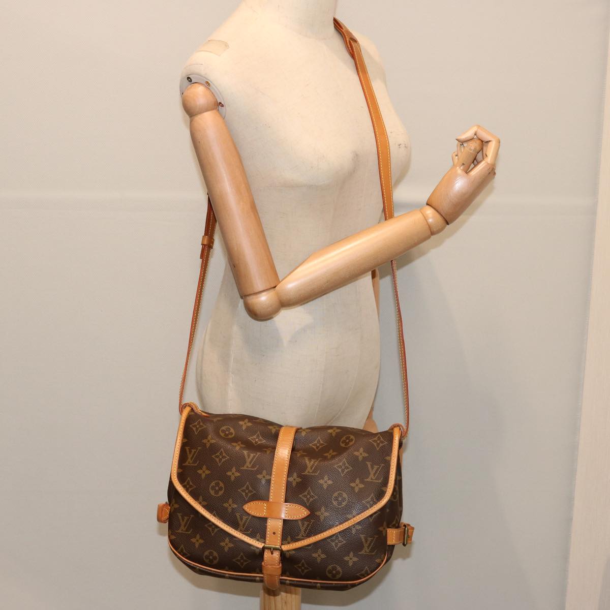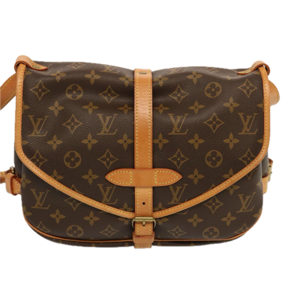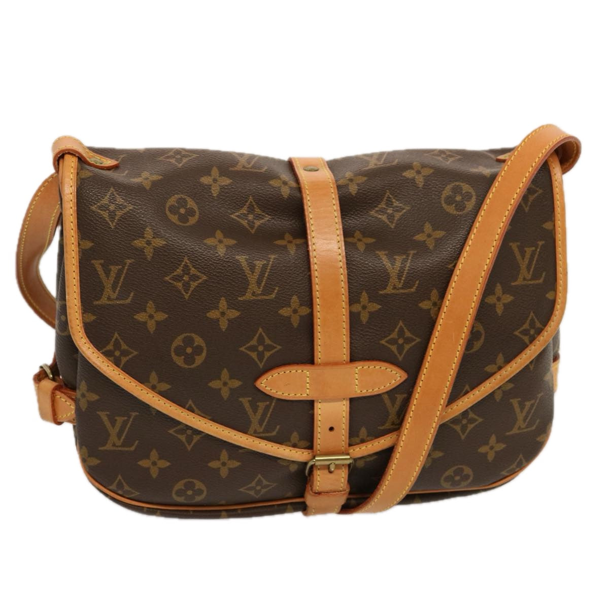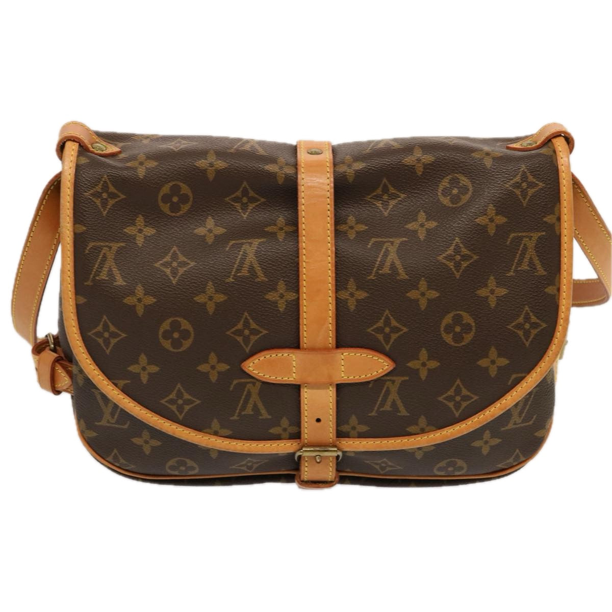 The Louis Vuitton Saumur bag was introduced in 1970. This brown bag is made from Louis Vuitton's iconic coated canvas and adorned with natural cowhide leather trim. The bag features a flap closure, two front pockets, a large back pocket, and an adjustable leather shoulder strap for comfortable carrying. The interior and its pockets provide you with ample space to organize your belongings.