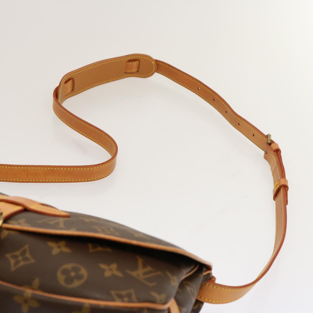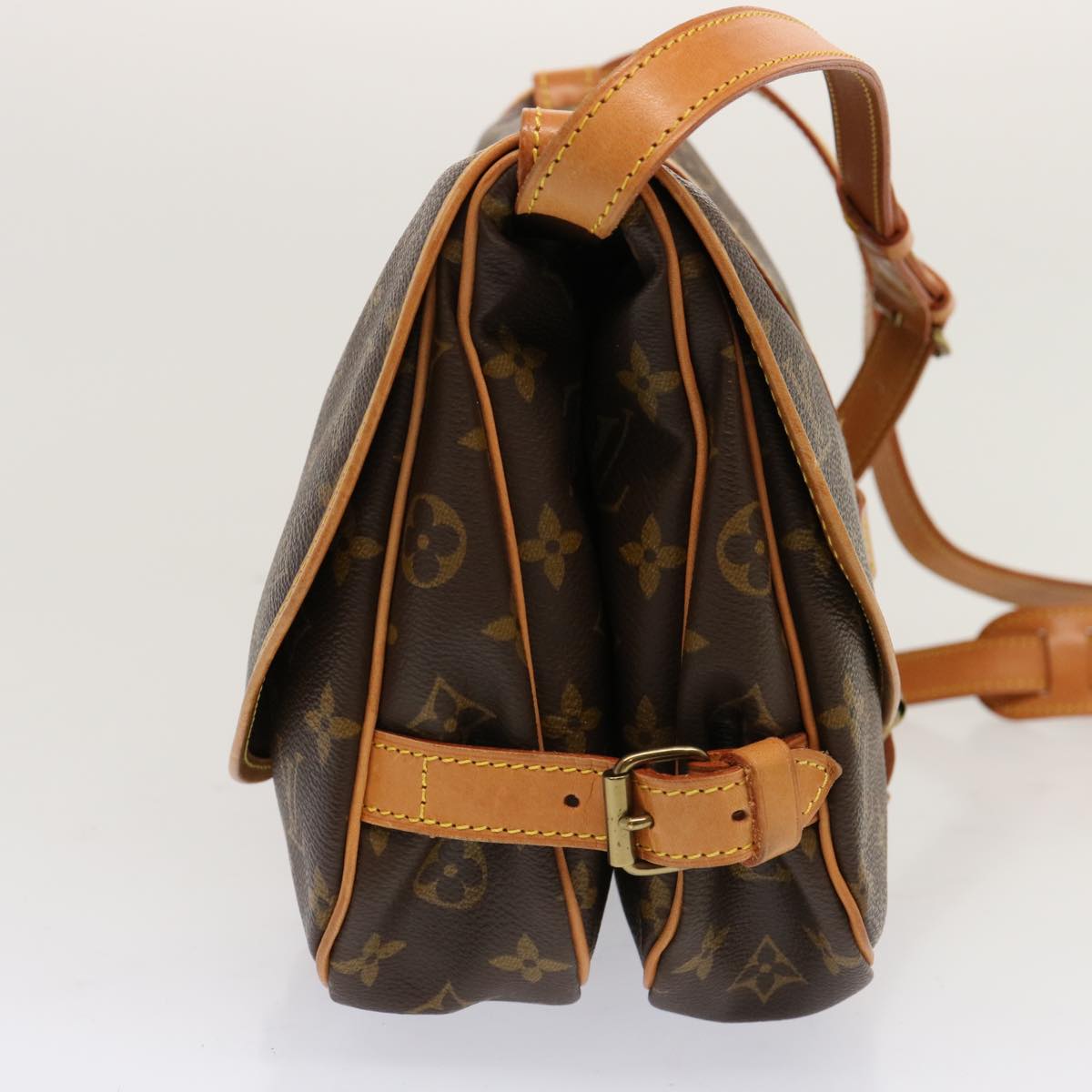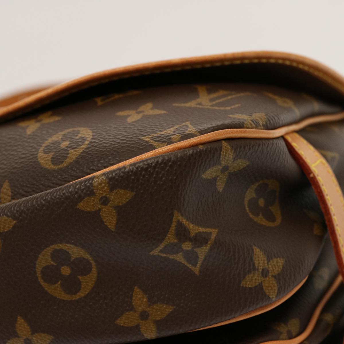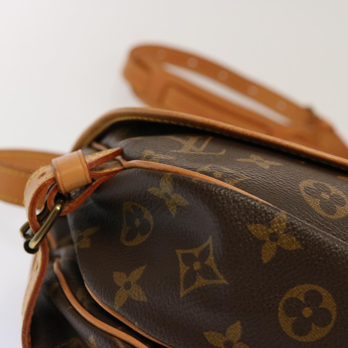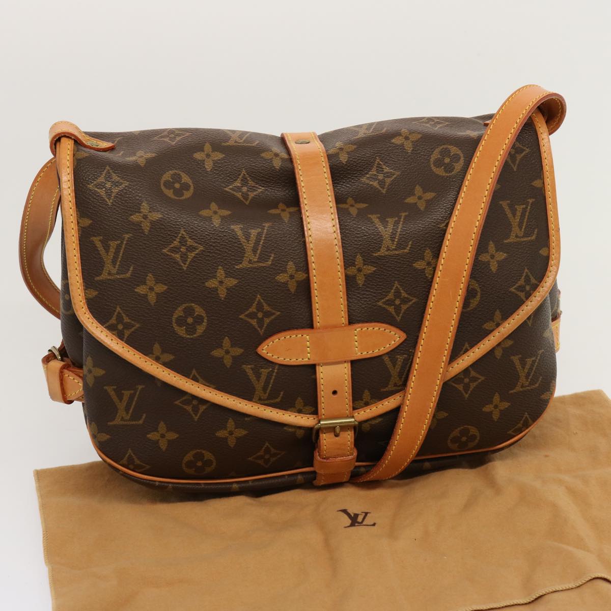 The Louis Vuitton Saumur bag was introduced in 1970. This brown bag is made from Louis Vuitton's iconic coated canvas and adorned with natural cowhide leather trim. The bag features a flap closure, two front pockets, a large back pocket, and an adjustable leather shoulder strap for comfortable carrying. The interior and its pockets provide you with ample space to organize your belongings.