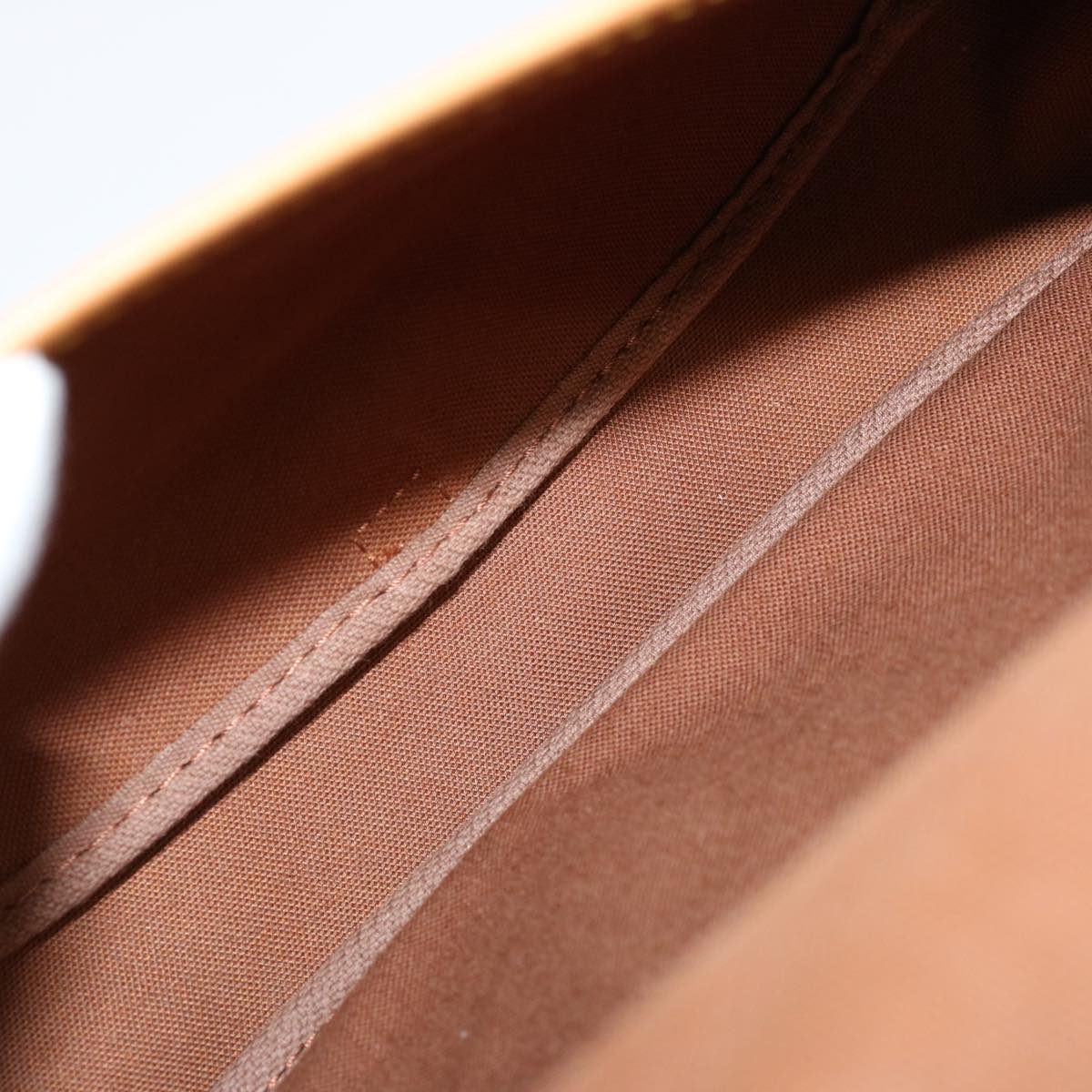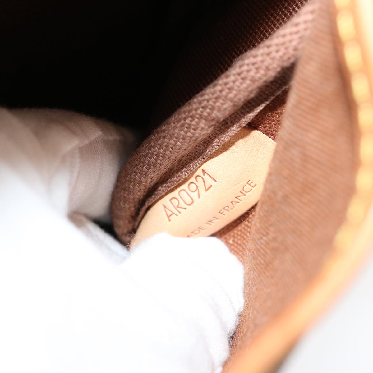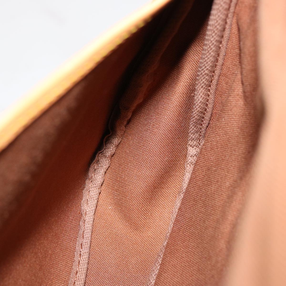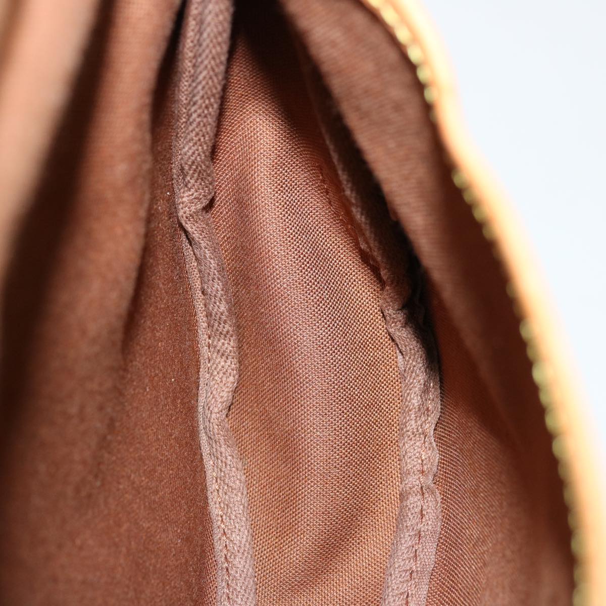 The Louis Vuitton Saumur bag was introduced in 1970. This brown bag is made from Louis Vuitton's iconic coated canvas and adorned with natural cowhide leather trim. The bag features a flap closure, two front pockets, a large back pocket, and an adjustable leather shoulder strap for comfortable carrying. The interior and its pockets provide you with ample space to organize your belongings.