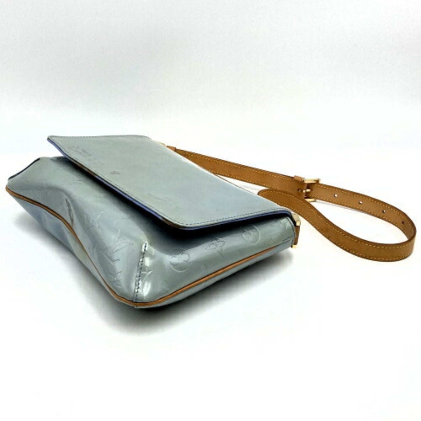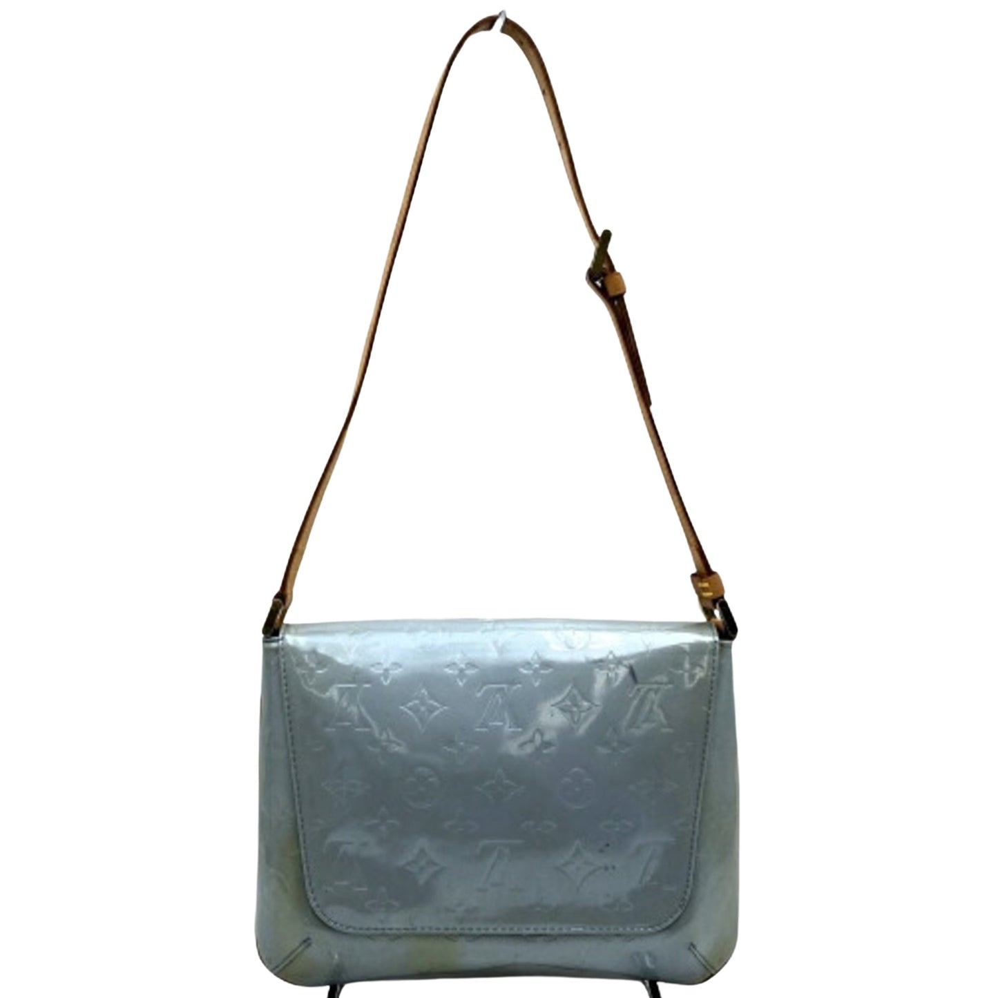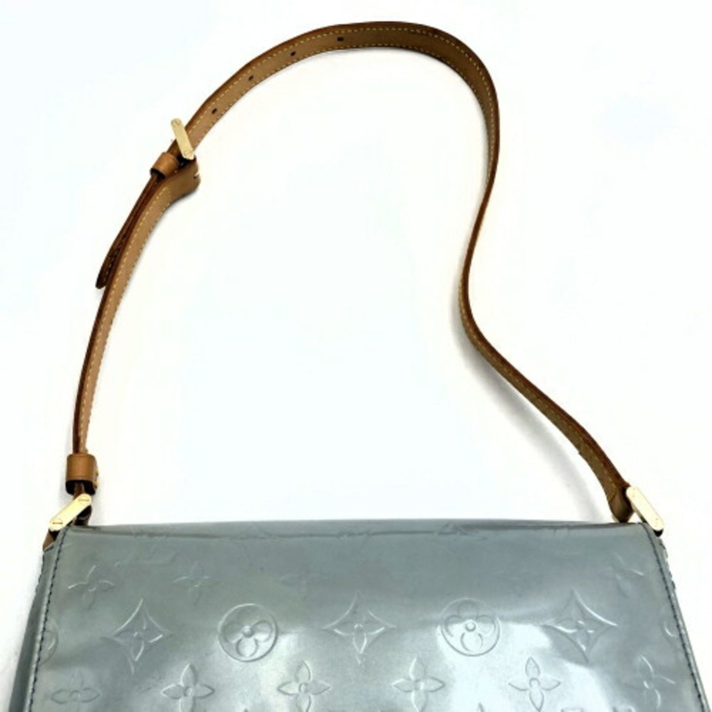 Elegant handbag in monogram patent leather and natural leather, adorned with gold-tone metal trim. It features a single adjustable natural leather handle for hand or shoulder carry and a flap closure with a snap button. The interior is lined with leather and includes a patch pocket.